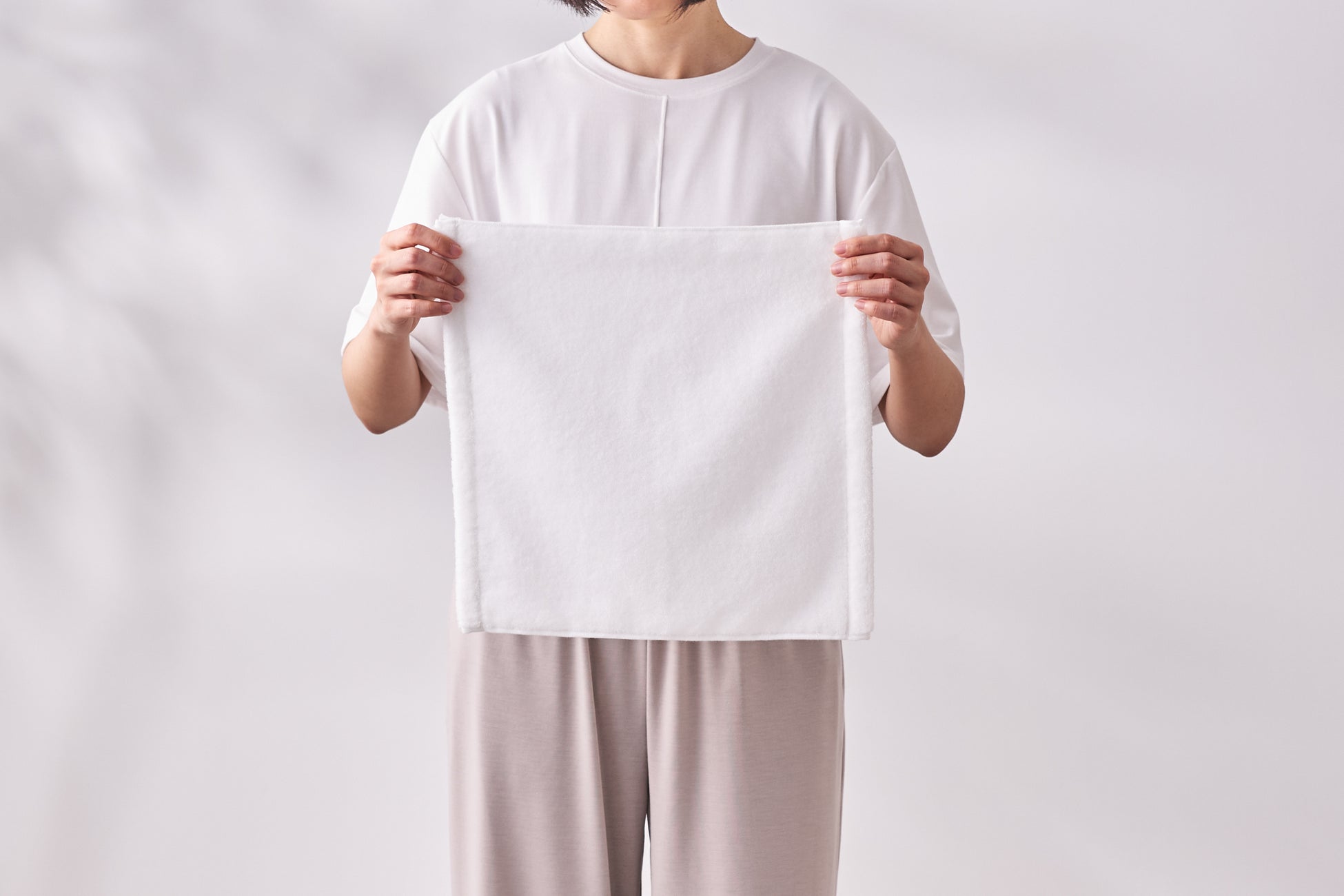 生活習慣や価値観、またトレンドの変化も相まって、洗顔後にティッシュで顔を拭く人が増加したことに着目。洗顔後やお風呂上がりに、肌にやさしく、タオルならではの気持ちよさを感じてもらいたいという想いから、プロジェクトはスタートしました。肌の大敵と言われる摩擦刺激を少なくするために、触れるだけですっと水分を吸収し、毛羽落ちを感じさせない素材開発に試行錯誤を重ねました。