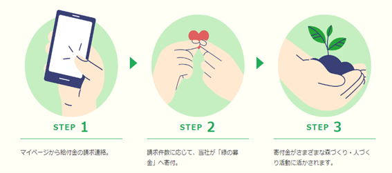 本プロジェクトは、本プロジェクトの実施期間中に、マイページで給付金をご請求いただくことで、緑の募金への寄付につながるプロジェクトです。