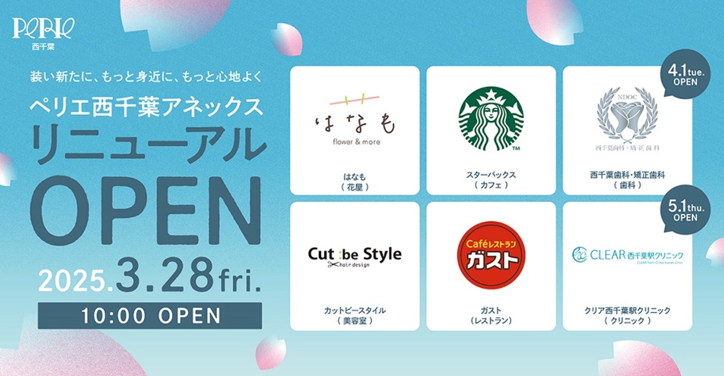 株式会社千葉ステーションビル(本社:千葉市中央区、代表取締役社長:弭間 俊則)が運営するJR西千葉駅直結の「ペリエ西千葉 アネックス」(以下、アネックス)が、3月28日(金)にリニューアルオープンします。また、オープンを記念して、「リニューアルOPENイベント」を実施します(4月6日まで)。