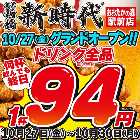 「新時代 流山おおたかの森駅前店」のオープンを記念し、ドリンク全品を1杯94円でお楽しみ頂けるキャンペーンを開催します。