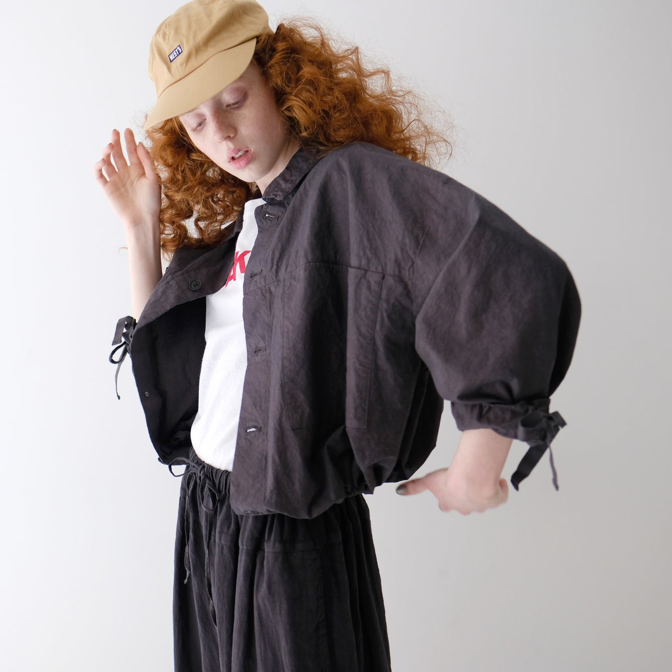 ハリ感のあるスーピマコットンで仕立てたショート丈コート。袖口のリボンで袖丈やシルエットの調節が可能。足元にはレディなヒールを併せて、大人なカジュアルスタイルを演出。