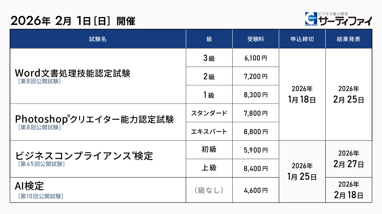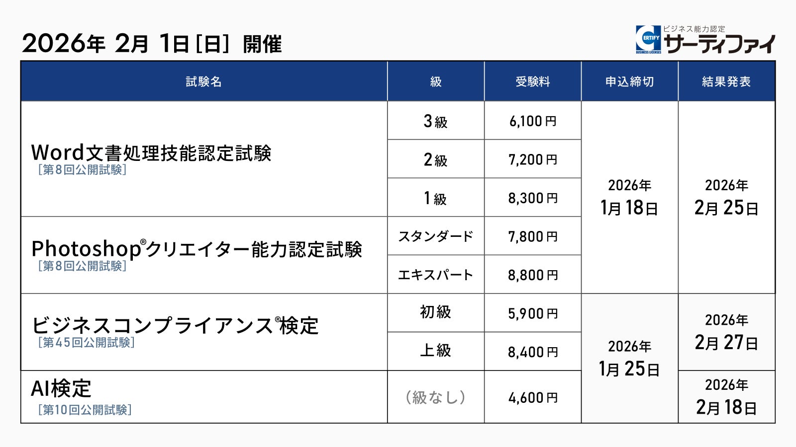 株式会社サーティファイ(本社:東京都中央区、代表取締役:瀧澤茂、以下「サーティファイ」)は、2026年2月1日(日)に開催する「Word文書処理技能認定試験」「Photoshop®クリエイター能力認定試験」「ビジネスコンプライアンス検定」「AI検定」の公開試験の申込受付を2025年11月18日より開始しました。