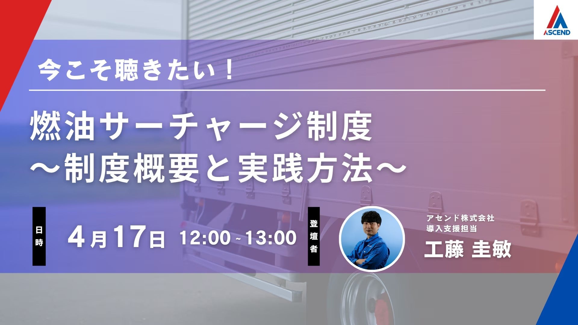 物流DXを推進するアセンド株式会社(本社:東京都新宿区、代表取締役:日下瑞貴、以下「当社」)は、2026年4月17日(金)、運送における燃油サーチャージ制度をテーマに無料オンラインセミナーを開催いたします。