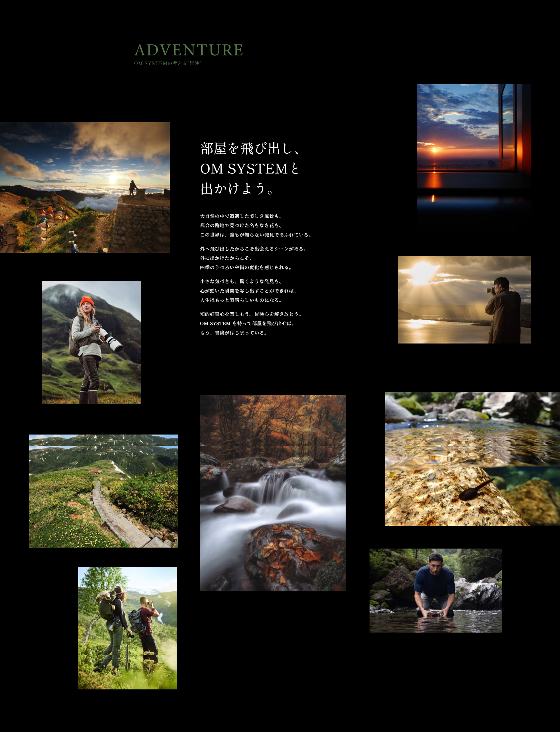OM SYSTEMは、「人生にもっと冒険を」をブランドタグラインに、決定的瞬間を捉える喜びや、想像を超える作品作りなど、映像体験をもっとワクワクする冒険に変えていきます。アウトドアでの使用に応える高い信頼性と機動性、そして優れた描写性能をもつカメラシステムをはじめとする製品や各種セミナーなどを通じて、自然の中で心豊かになる体験を提供し、一人ひとりのアウトドアライフバリューを高めるブランドです。