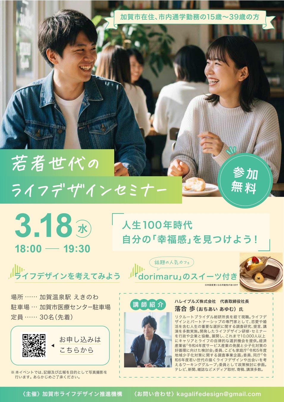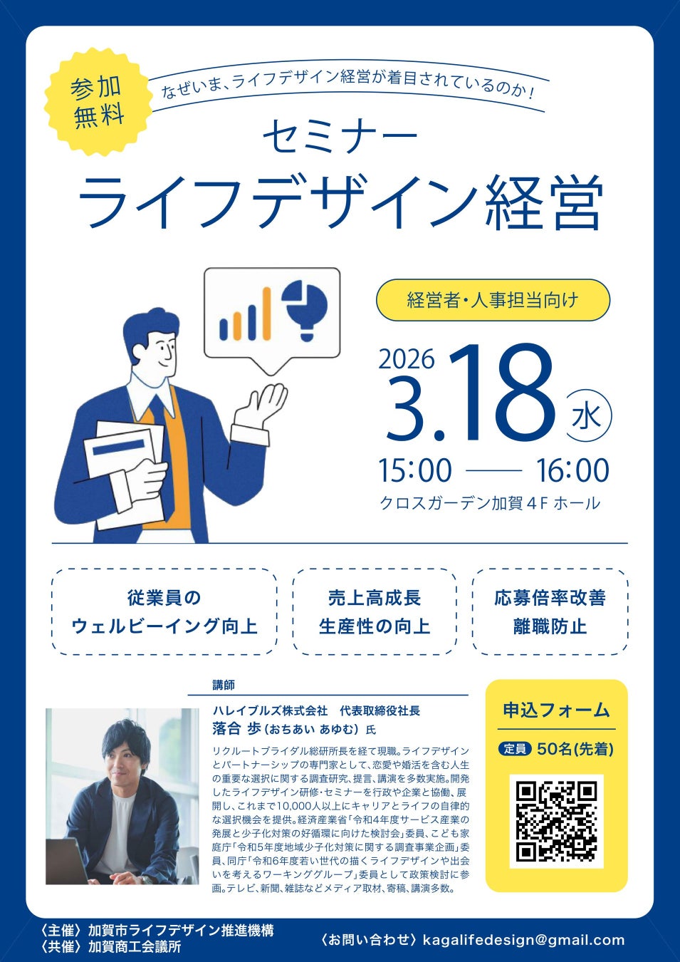 講師には、ハレイブルズ株式会社の落合歩氏をお迎えし、ライフデザイン経営の視点および若者のライフデザイン支援の現場での知見をもとにご講演いただきます。