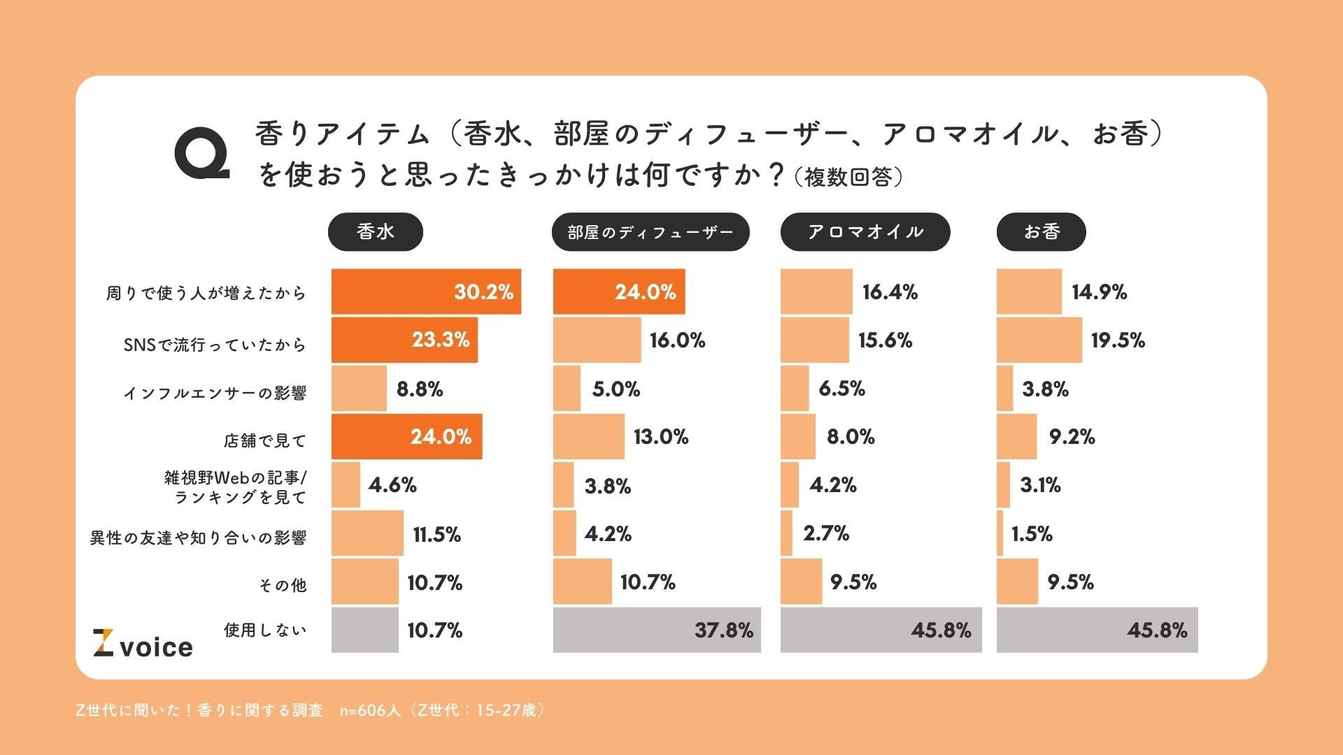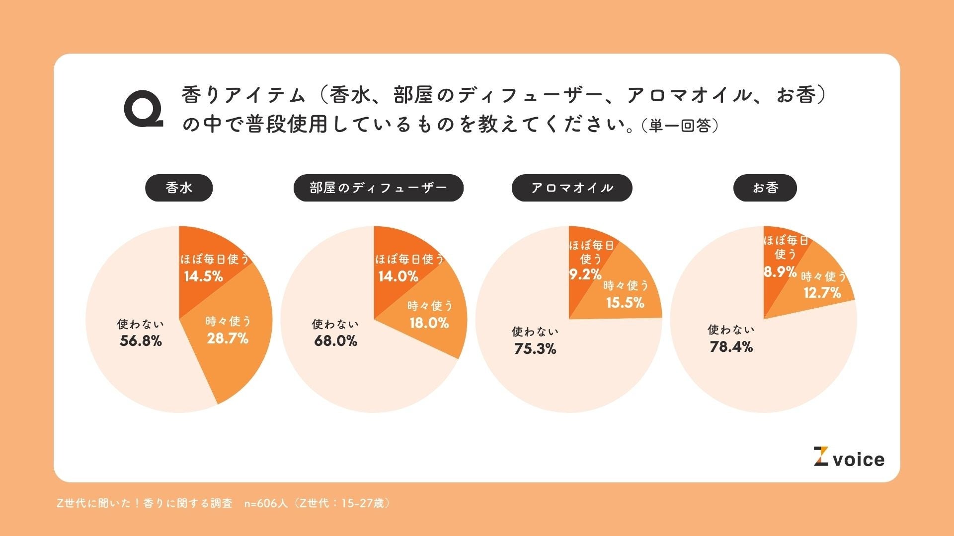 まず、Z世代に普段使用している香りものについて聞いたところ、「香水」がもっとも使用率が高く43.2%という結果に。次いで「部屋のディフューザー(32.0%)」、「アロマオイル(24.7%)」。「お香」はもっとも少ない21.6%となりました。