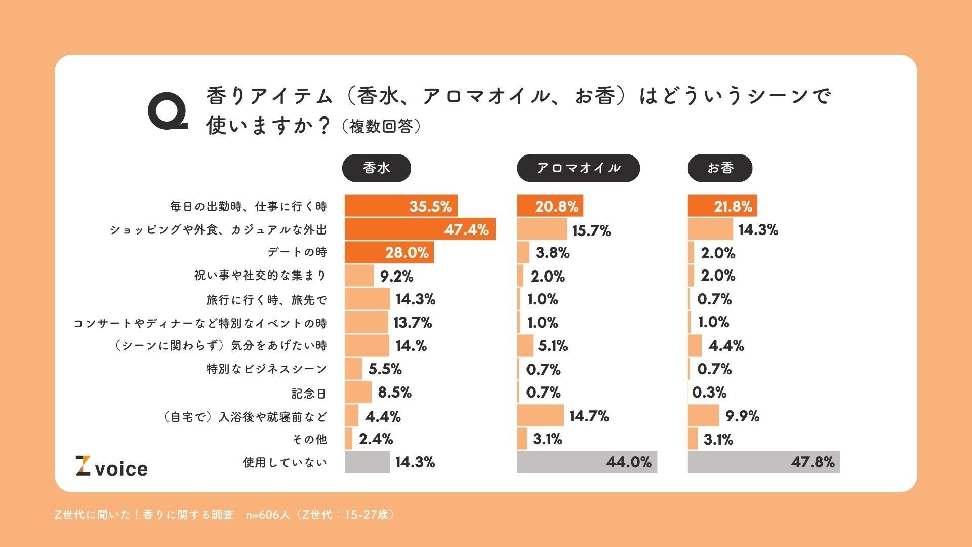 まず香水については、「ショッピングや外食、カジュアルな外出」がもっとも多く、約半数の47.4%が使用シーンとしてあげていました。次に多かったのが「毎日の出勤時、仕事に行くとき(35.5%)」で全体的に仕事やフォーマルな場よりも、プライベートのシーンで活用されていることがわかります。