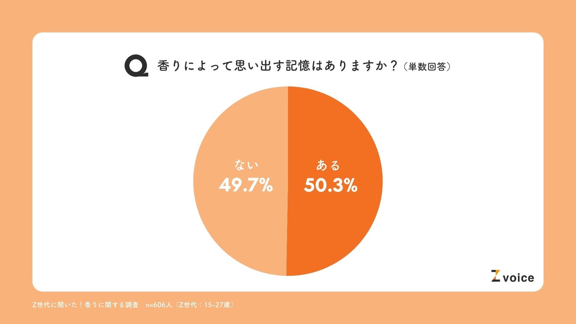 最後に、香り全般に関する質問として記憶との結びつきを聞いたところ、Z世代の約半数にあたる50.3%が「香りによって思い出す記憶がある」と回答。