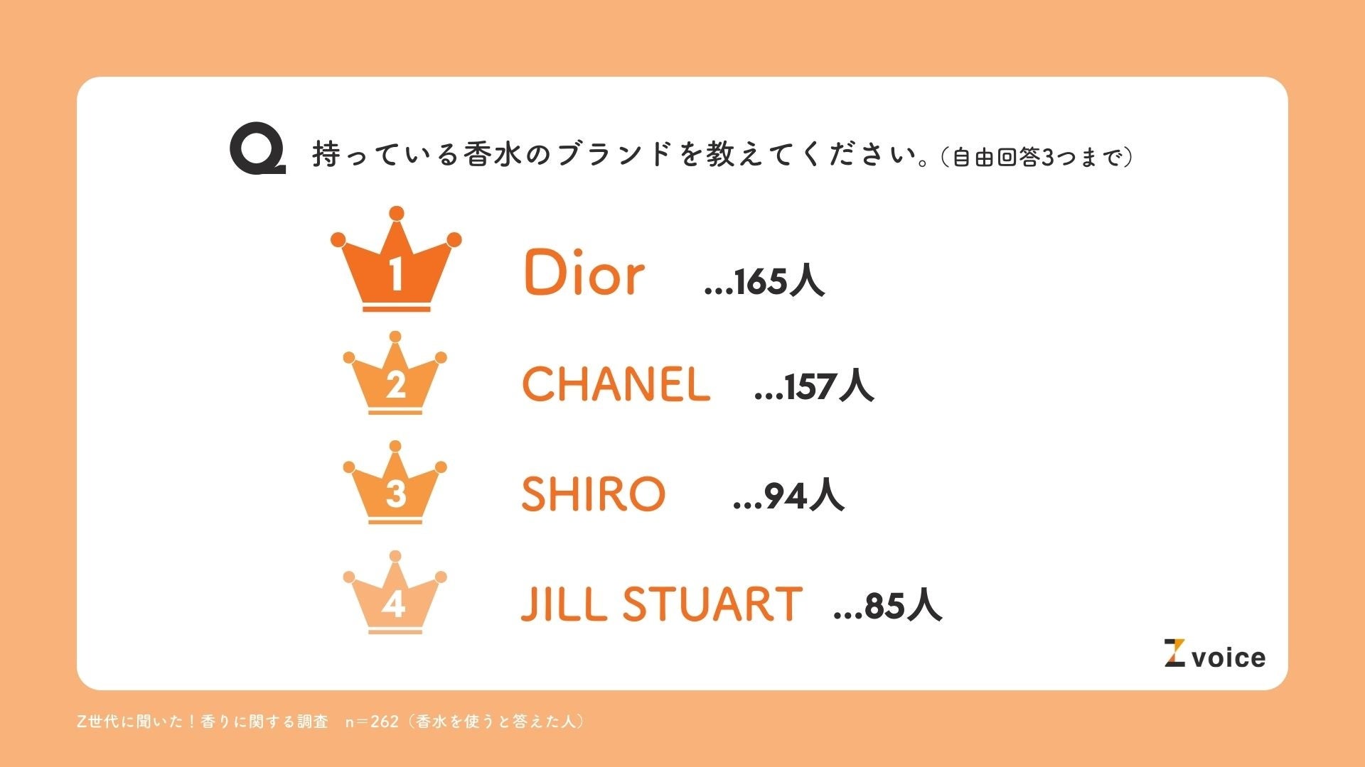 3位には日本初の香水ブランドのSHIRO(94人)、4位にはJILL STUART(85人)がランクインし、今回の調査では主にこの4ブランドが特にZ世代からの支持を集めていることがわかりました。