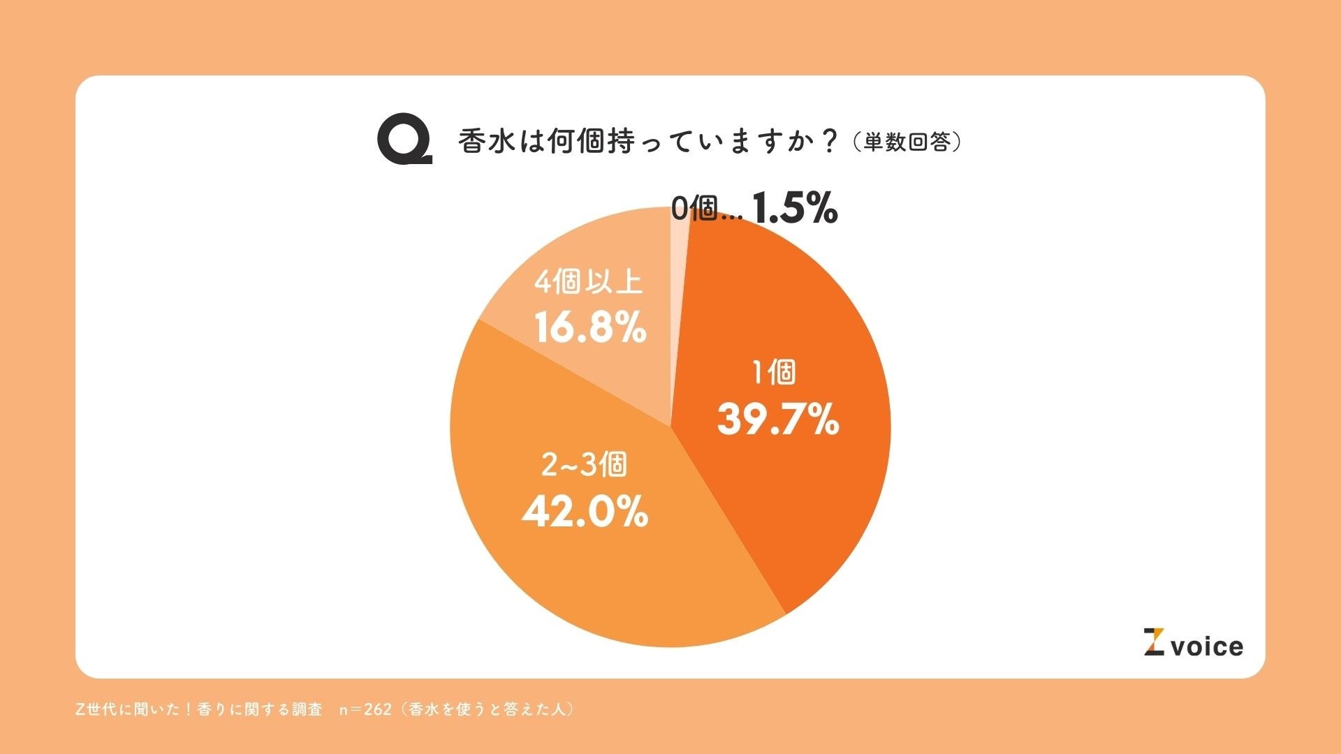 もっとも多かったのは2〜3個持っているという回答で42.0%。4個以上所有している人も16.8%にのぼり、複数の香水を使い分けるのがスタンダードであることがうかがえます。