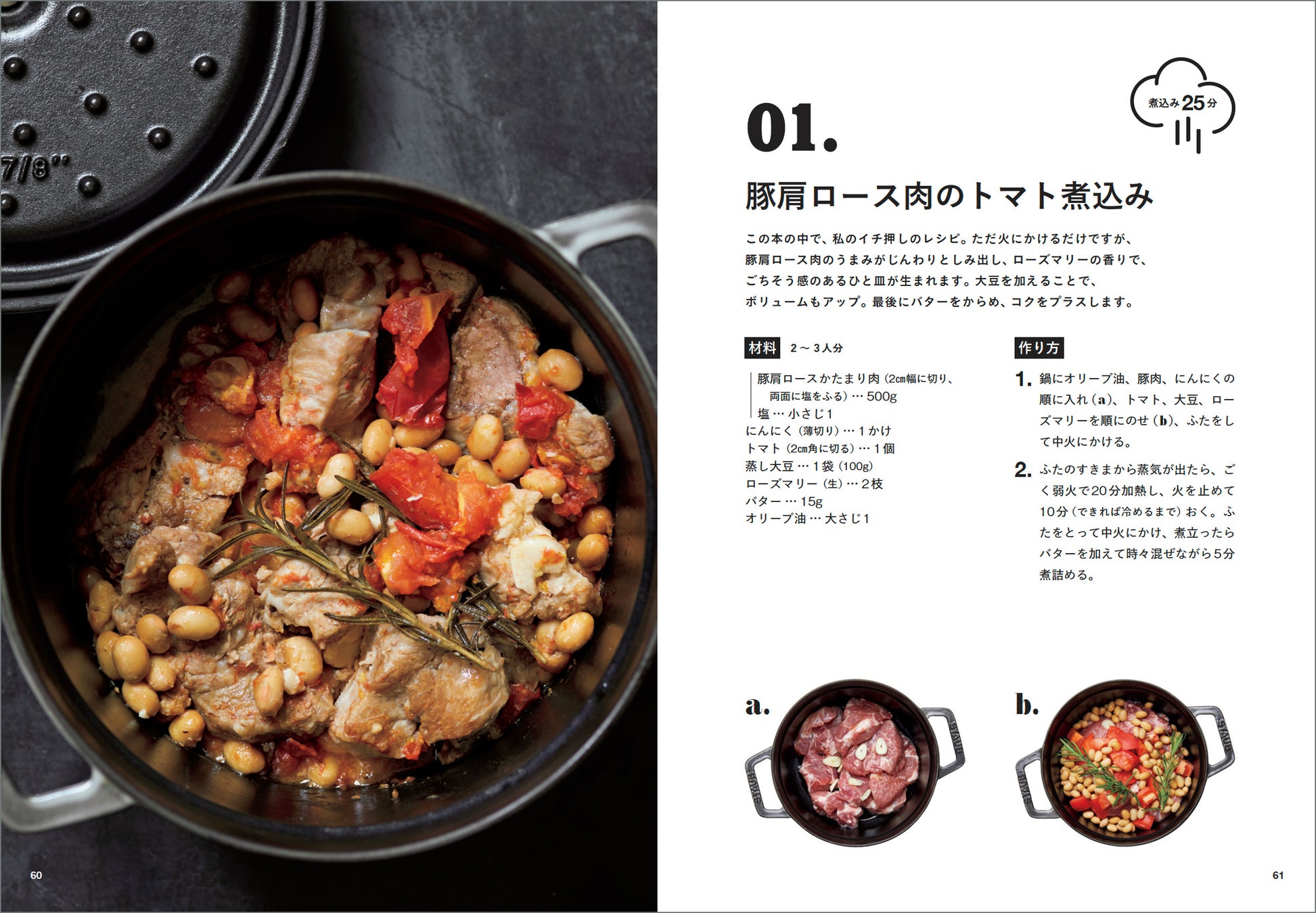 加熱時間はやや長めなものの、かたまり肉を使ったり、材料を大きくごろっと切って作る、手間いらずでボリューム感のある煮込みももちろん掲載。余熱を利用すれば、短い煮込み時間で大ぶりな肉や根菜も味しみしみになるのがストウブの魅力です。