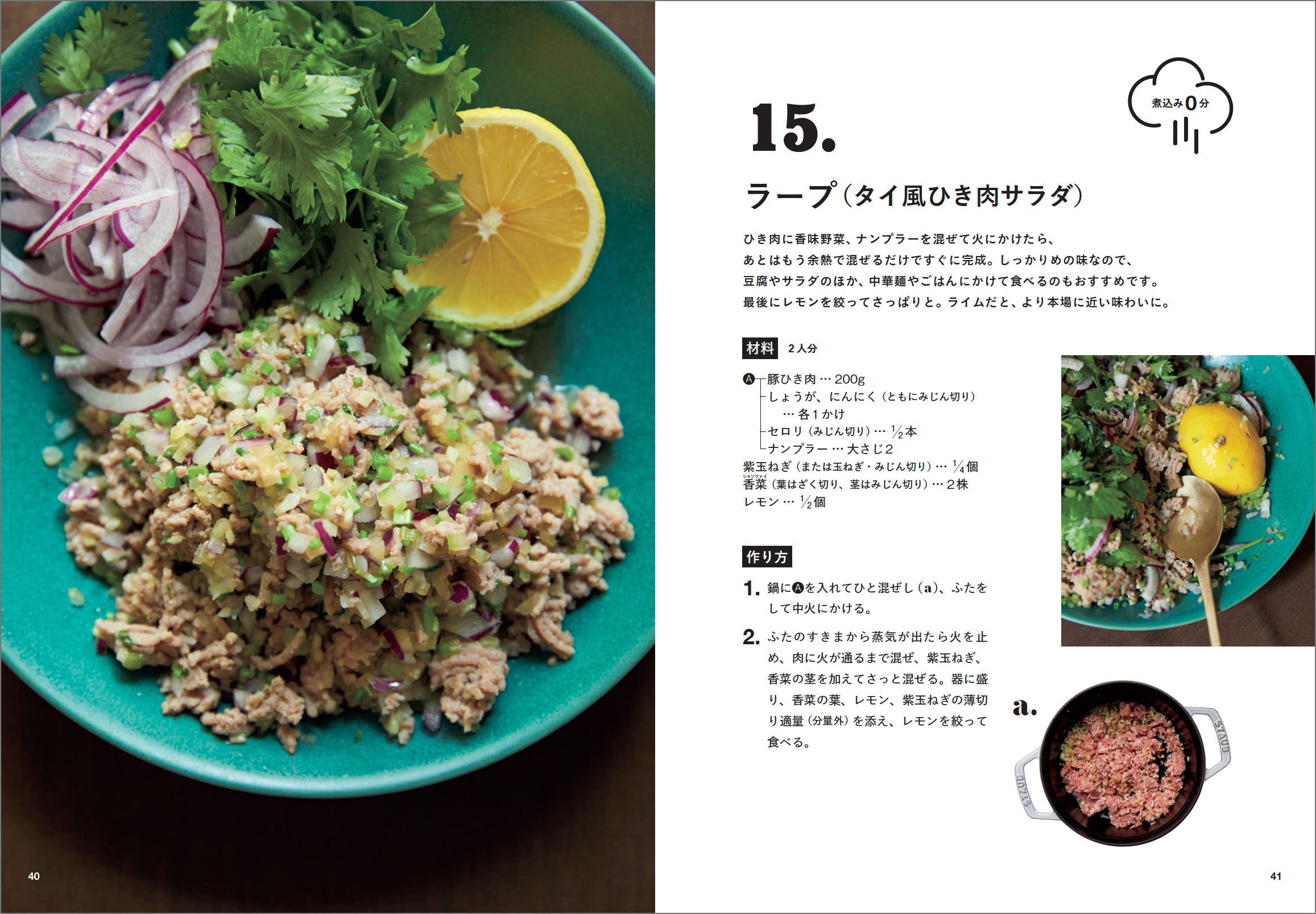 煮込み時間わずか3〜15分で作れる、思い立ったらすぐに作れるおかずをたっぷりとご紹介。安価だけれどパサつきがちな鶏むね肉も、さっと火が通ってジューシーに仕上がるのが、ストウブのすごいところ。ひき肉なら、余熱だけで煮込み0分で料理が完成!