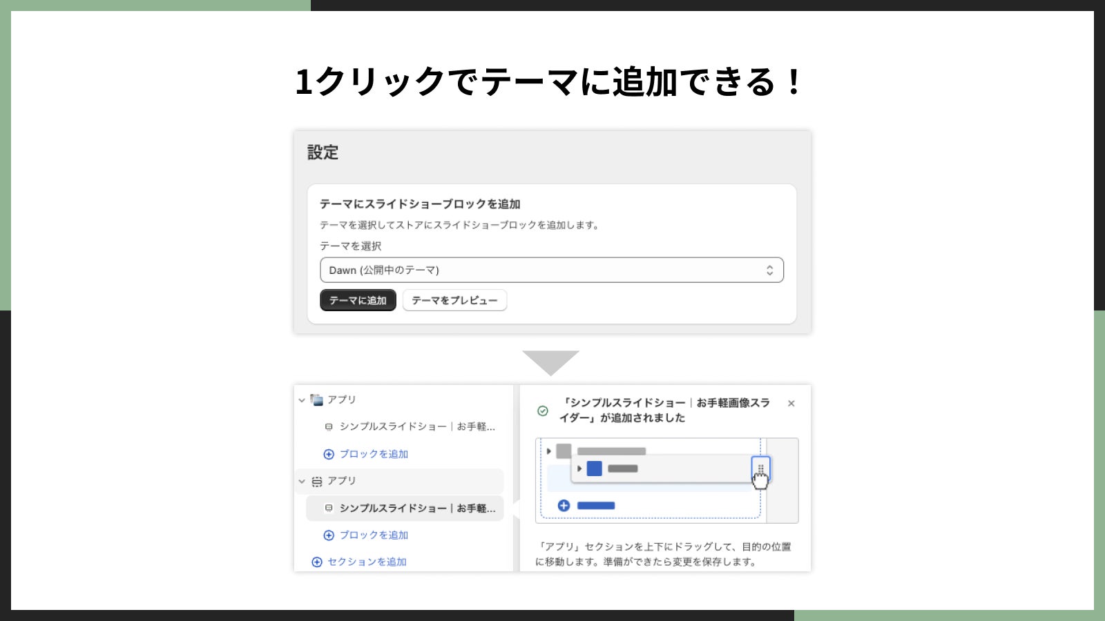 「シンプルスライドショー|お手軽画像スライダー」は、1クリックでテーマに追加できます。