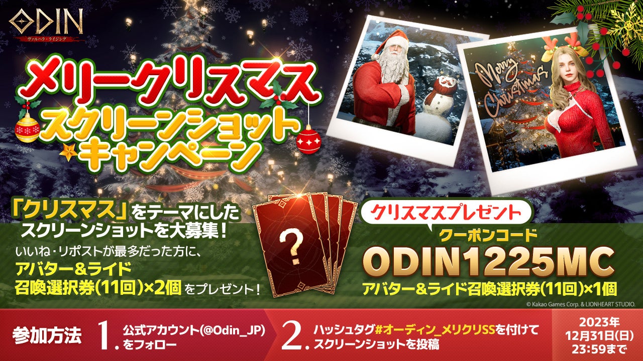 12月21日(木)より、クリスマスをテーマにした「メリークリスマス スクリーンショットキャンペーン」を開催します。『オーディン:ヴァルハラ・ライジング』公式X(旧Twitter)をフォローした状態で、クリスマスをテーマにしたスクリーンショットを投稿された方の中から、「いいね・リポスト」が最多だった方に、「アバター&ライド召喚選択券(11回)x2個」をプレゼント!