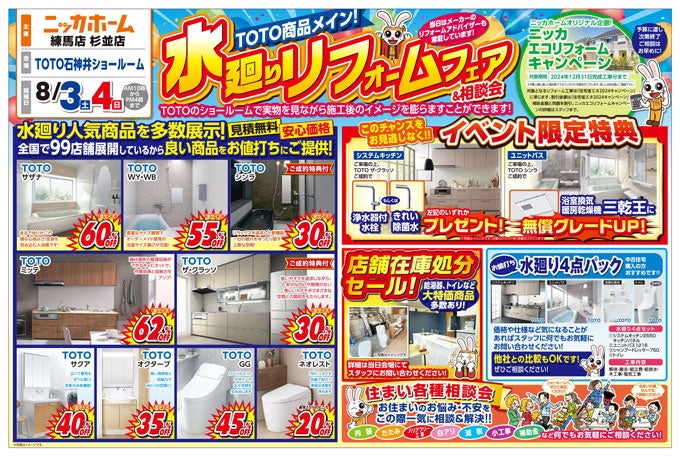 ニッカホーム杉並ショールーム&練馬ショールームが2店舗合同で大感謝祭を開催します!お得にリフォームができるチャンスです!今週末8/3(土)・4(日)の2日間は、ニッカホームのイベントにお越しください!
