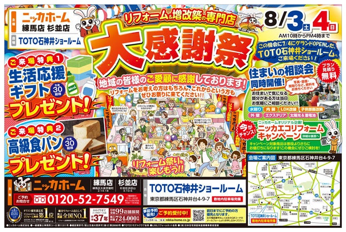 全国99店舗展開中の“リフォーム&増改築”のニッカホーム株式会社(愛知県名古屋市緑区篭⼭)の『杉並ショールーム』と『練馬ショールーム』の2店舗が合同で、大感謝祭と題したリフォームイベントをTOTO石神井ショールームにて、8月3日(土)・4日(日)の2日間限定で開催いたします。