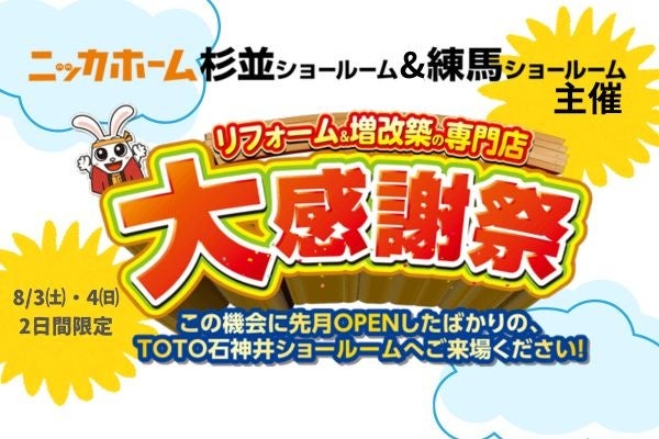 リフォーム&増改築でおなじみのニッカホームが、TOTO石神井ショールームにて、2024年8月3日(土)・4日(日)の2日間限定で、大感謝祭を開催いたします!