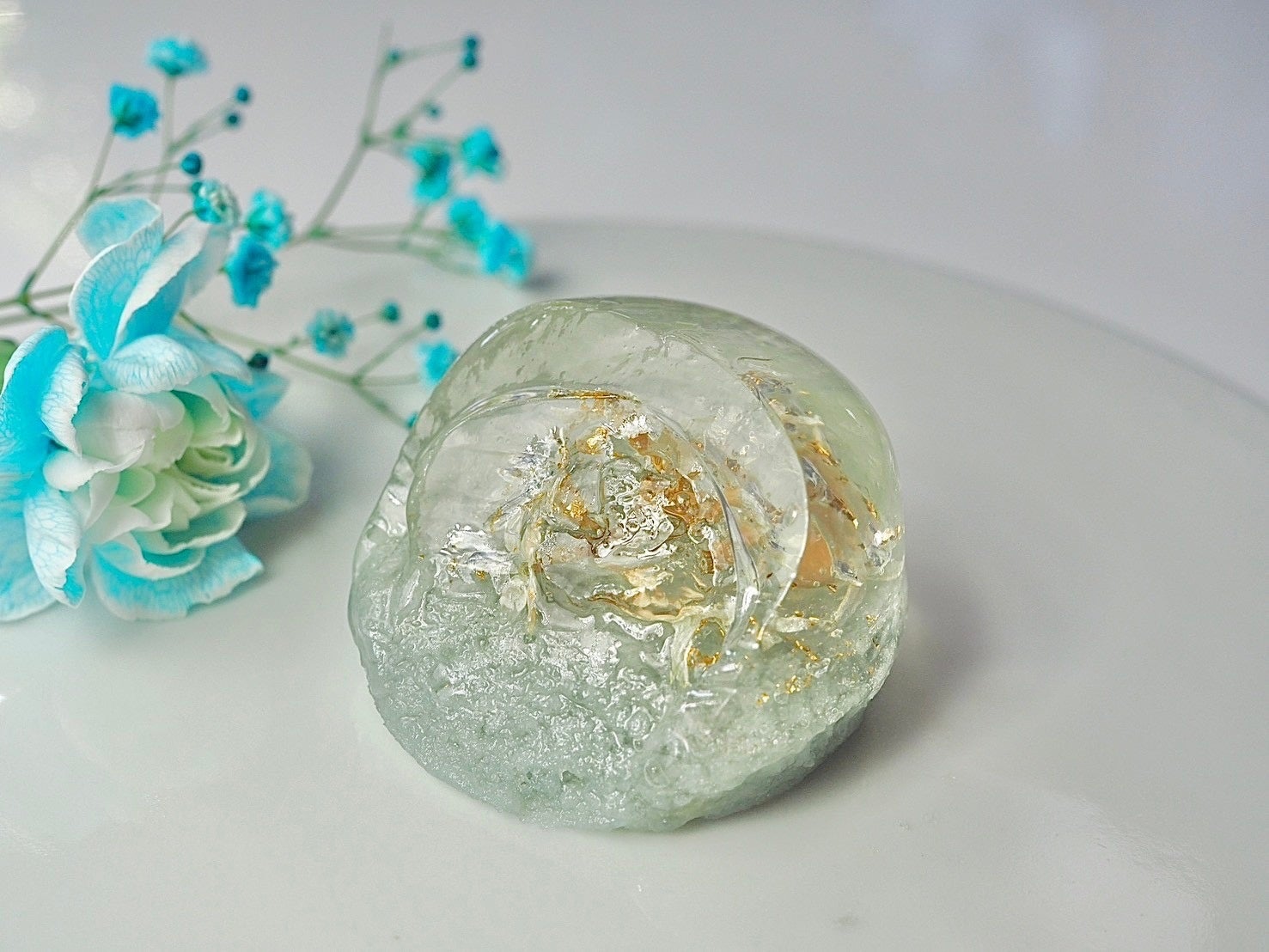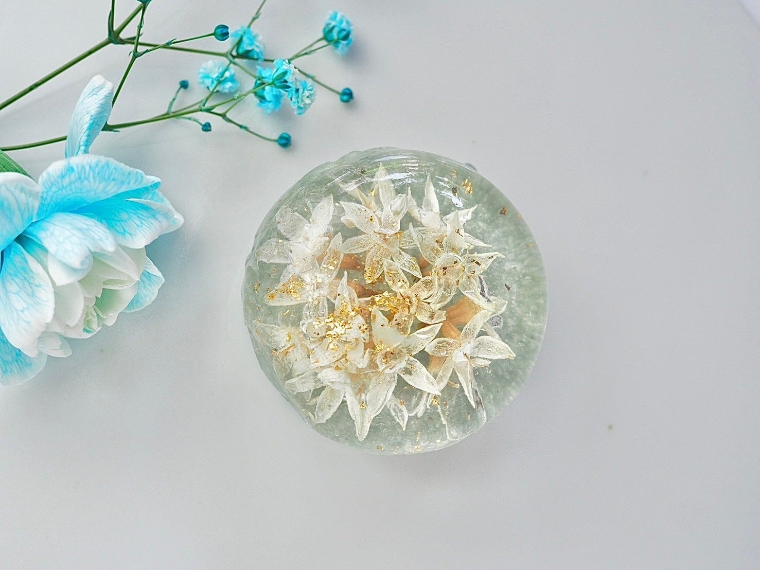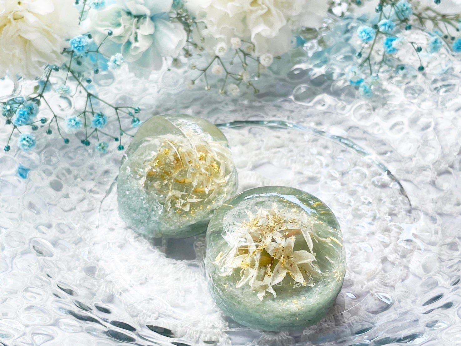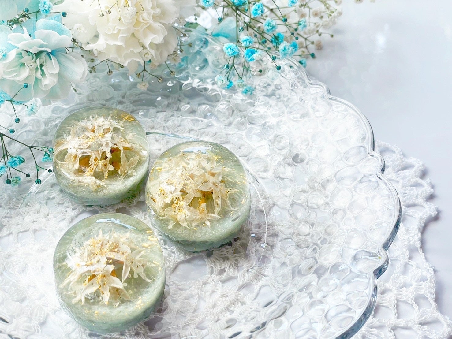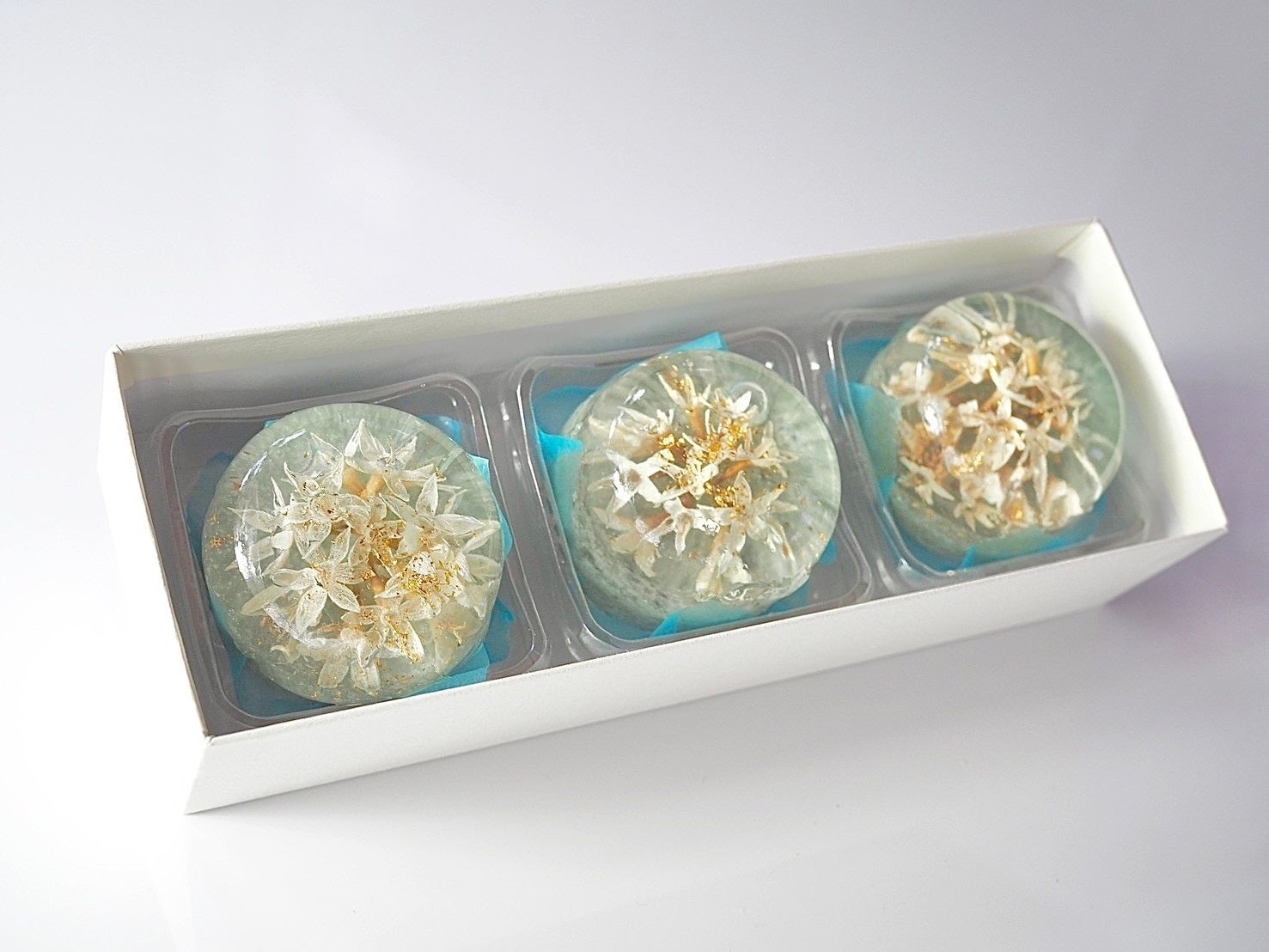 中のぷるぷるな桃味の錦玉羹※を口にいれた瞬間とろ~りとろけます。土台の浮島※にも自家製の桃餡がたっぷり入っており、上品な桃の香りが広がる寒天菓子です。冷やしていただくとより一層美味しく召し上がれます。閉じ込めてある純白のブーケはエディブルフラワーの一種「ペンタス」という品種を使用しています。その「ペンタス」をブーケのように丁寧に手作業で1輪ずつ立体的に組み立て、キラキラと輝く金箔製剤を散りばめた特別感あふれる『宝石のような純白ブーケ』に仕上げました。また、「ペンタス」の花言葉は「願い事」「希望が叶う」というお祝い事にピッタリなお花です。爽快な青空に広がる煌びやかな純白のブーケは大切な人へのプレゼントや自分へのご褒美・応援におすすめです。