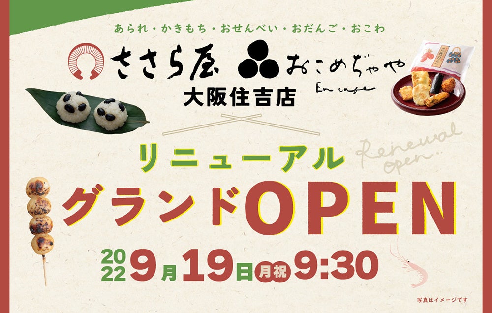 しろえびせんべいでお馴染み米菓専門店「ささら屋大阪住吉店」が9月19日(月)にリニューアルグランドオープンしました! 日の出屋製菓産業㈱