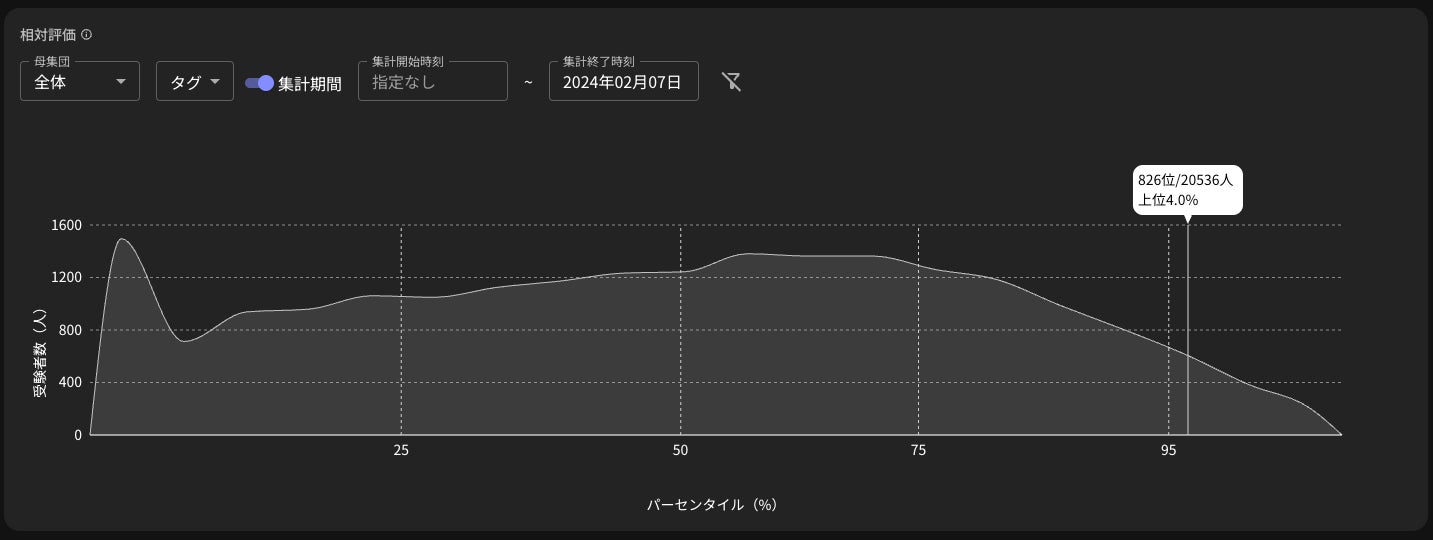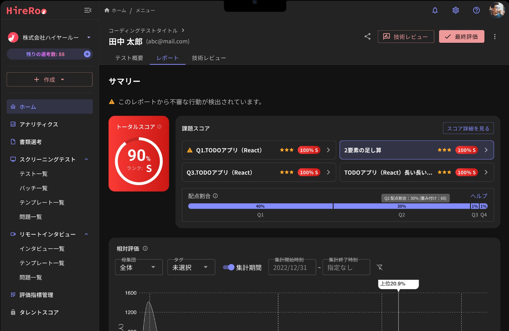 試験の結果は、コードの正答率、実行速度、コードの読みやすさなどを基に自動採点。同じ問題を解いた他の候補者と比較し相対評価を5段階評価で算出する他、社内のエンジニアとの比較も可能です。さらに英語対応により海外採用にも利用できます。