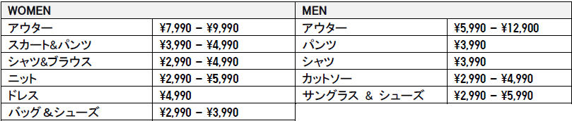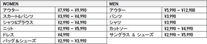 商品ラインナップ: ウィメンズ18アイテム、メンズ10アイテム、アクセサリー7アイテム