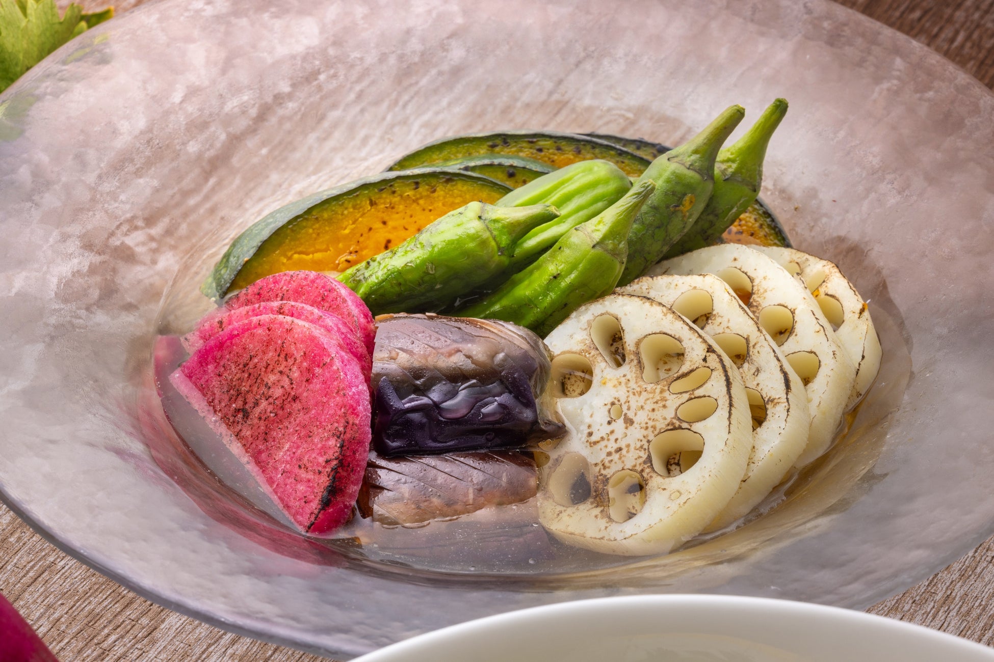 野菜の素材そのものを活かしたバーニャカウダやせいろ蒸しの他、野菜と豚肉を甘辛く炒めたご飯のすすむ中国の家庭料理「地三鮮(ディサンシェン)」、ディナーでは牛リブロースのBBQローストなど多彩な料理が並びます。