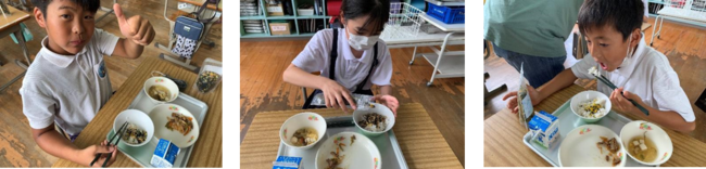 黙食をする子ども達ですが満面の笑みを浮かべて地域の恵みの詰まったふりかけご飯を味わいました。今回の調合をベースにして株式会社通宝が商品化し11月の全国ふりかけグランプリ会場で販売する予定です。