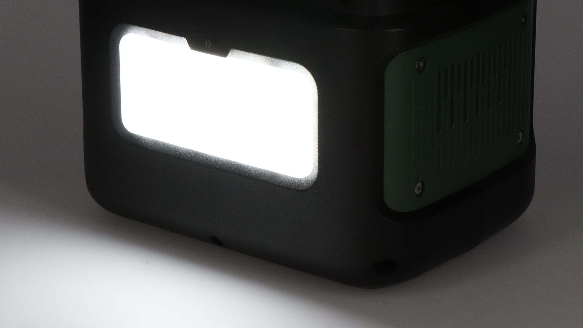 本体背面には3段階で明るさを調節できるLEDライトが搭載されています。屋外や車内、停電時など照明のない環境下でも明かりを確保できます。