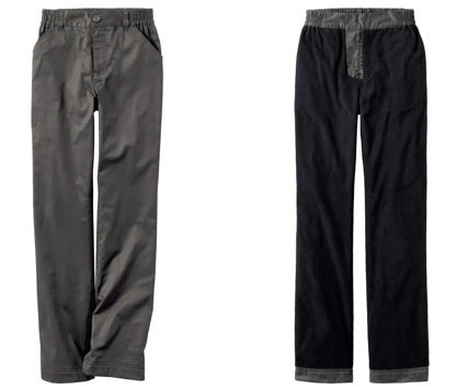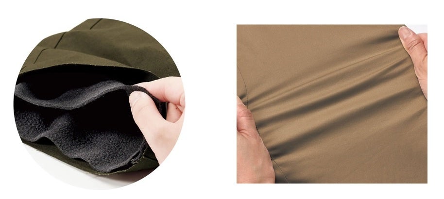綿ストレッチ+ふわふわフリースの2枚仕立てで重ねばき不要!!表裏は貼り合わせではなく縫い合わせにすることでストレッチ性を損なわれず動きやすい。