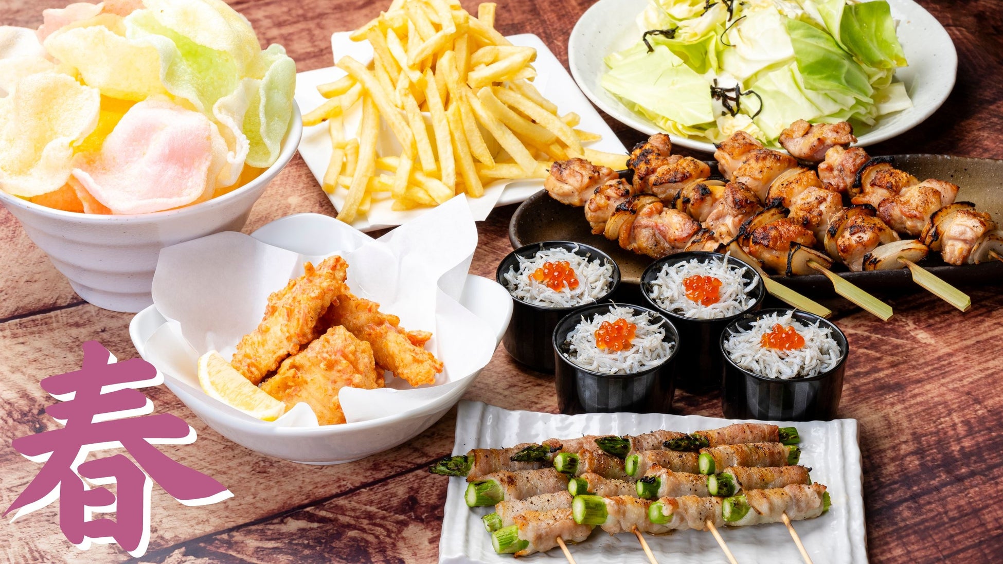 アスパラ肉巻きや、紅生姜塩ザンギ、釜揚げしらすご飯がついて気軽に楽しめるコースとなっている。