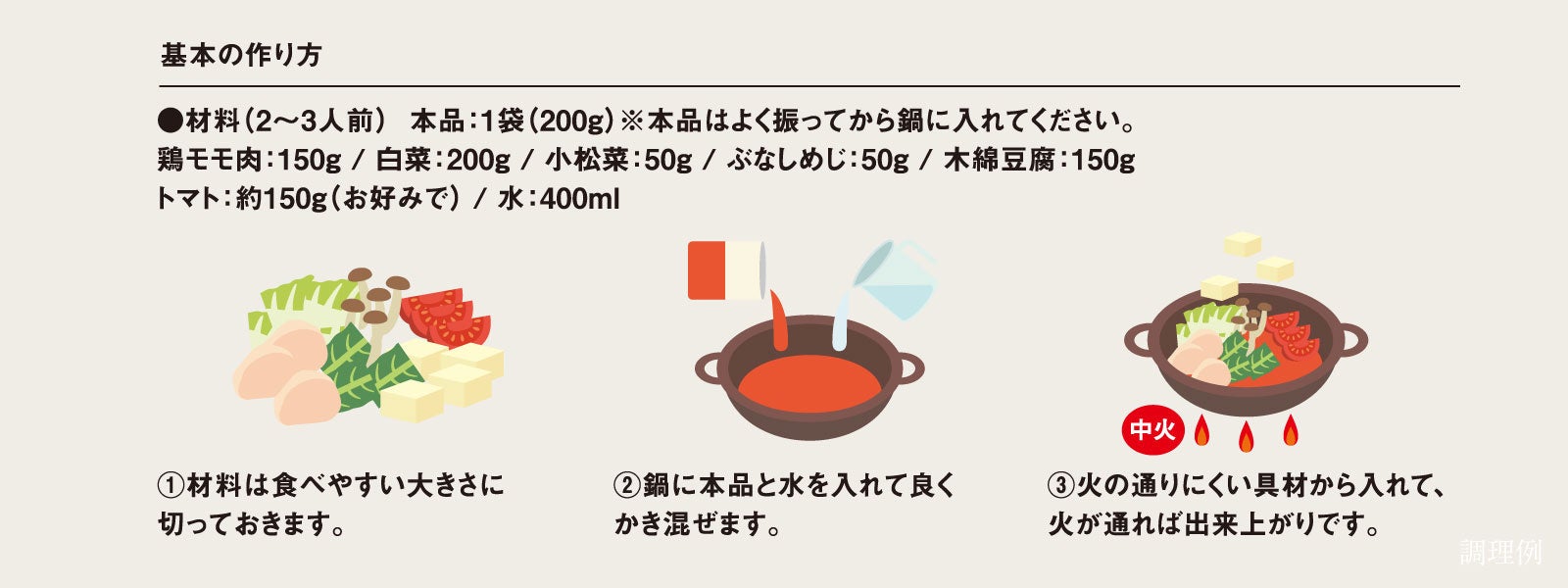 トマトこうじの旨みがきいた、さっぱりとした味わいの鍋の素です。鍋に加える具材の持ち味をトマトこうじが引き出します。トマトと相性の良いハーブを加えて爽やかに仕上げた〆まで飽きの来ない味わいです。【価格:450円(税込) 内容量:200g】※濃縮タイプ