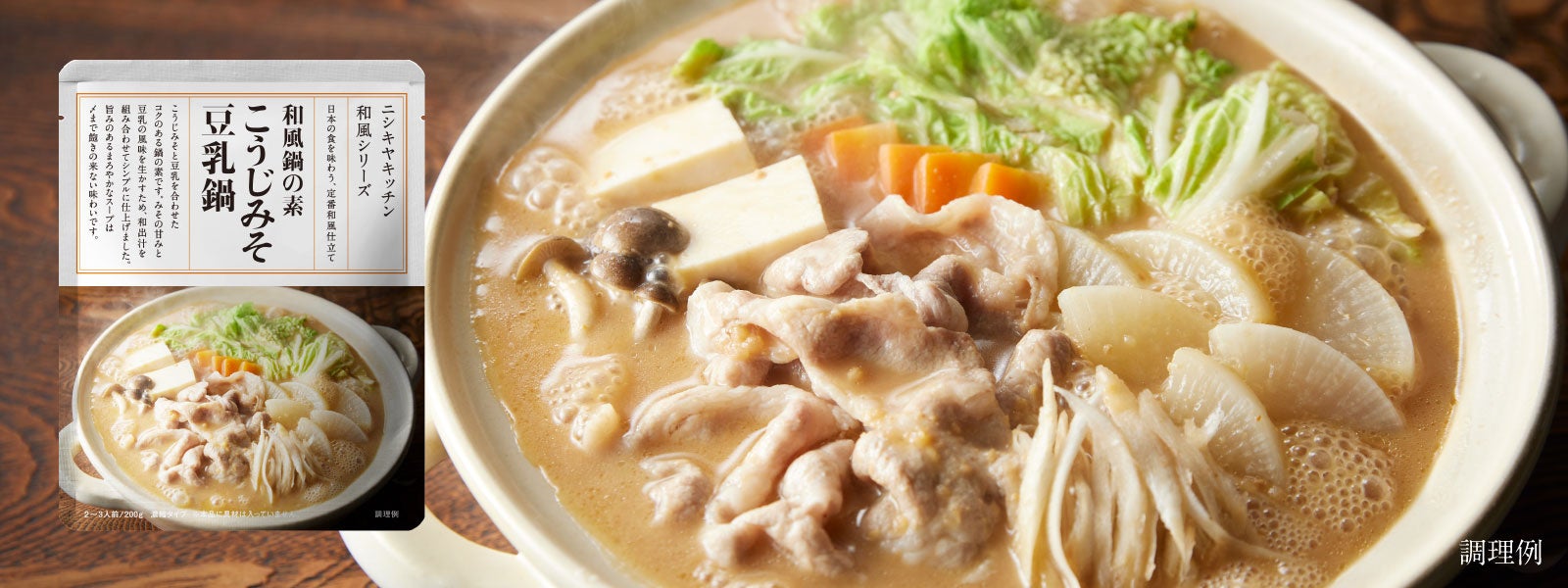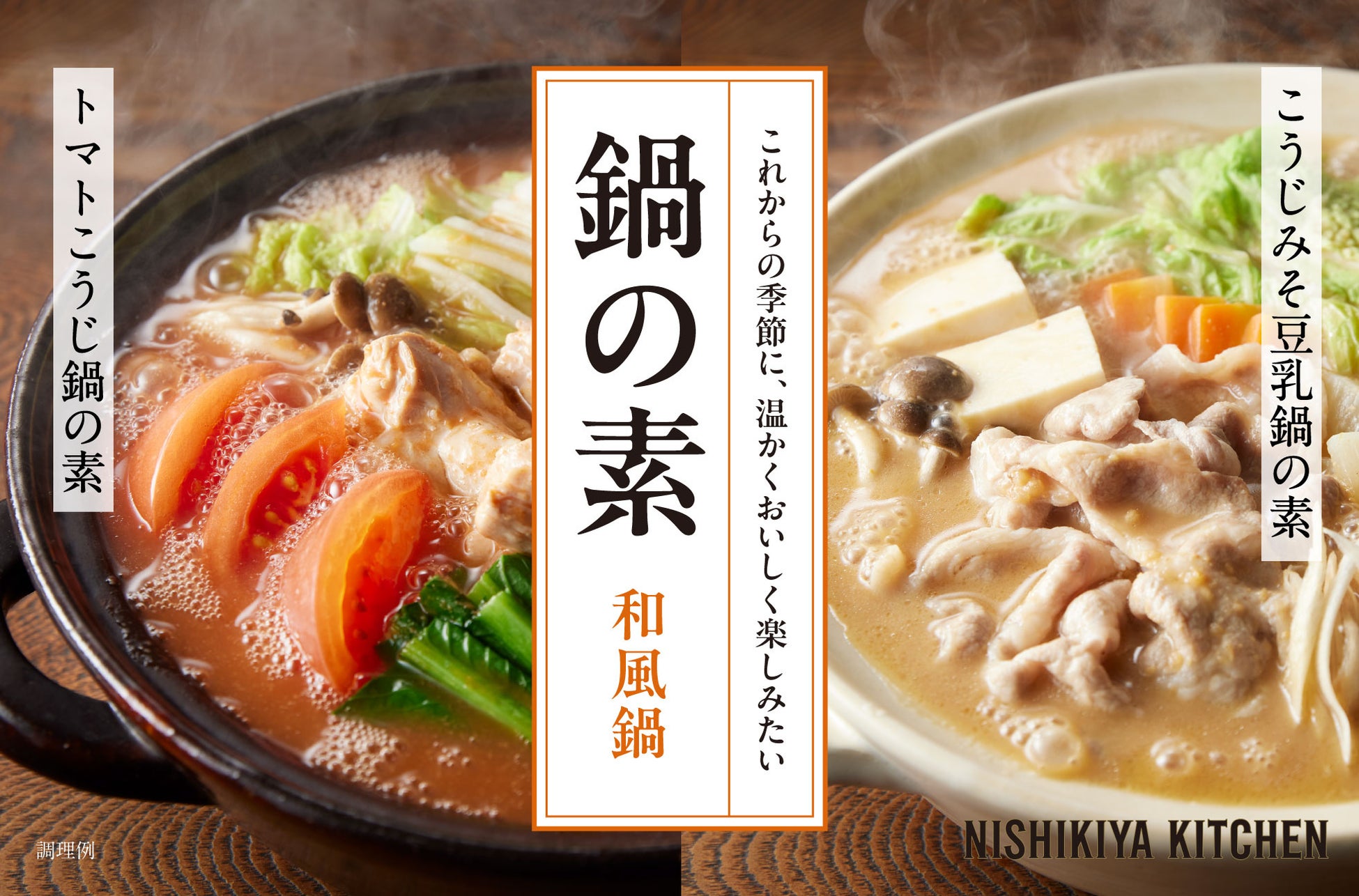 NISHIKIYA KITCHEN(ニシキヤキッチン)(株式会社にしき食品 本社:宮城県岩沼市、代表取締役:菊池洋)は、2024年10月3日(木)より、新商品である和風の味わいの鍋の素「トマトこうじ鍋の素」と「こうじみそ豆乳鍋の素」を発売いたします。発酵食品である「こうじ」は美容・健康面等で注目度の高い調味料です。ニシキヤキッチンでは、オリジナルの調味料を開発したいという想いから2021年より「こうじ」の研究を開始しました。研究開始から約3年の歳月を経て、甘みや旨みのある米こうじと、うま味成分であるグルタミン酸を多く含むトマトをかけ合わせた、ニシキヤキッチンオリジナルの「トマトこうじ」が完成しました。「トマトこうじ鍋の素」に使用しているオリジナルのトマトこうじは、だしやコンソメ等を使わなくても、味に深みが出ることが特長です。旨みも強く、他の調味料を控えることができます。ニシキヤキッチンの鍋の素は、すでに販売している個性豊かな3種類と今回の2種の新商品を合わせて5種類のラインナップとなります。これからの季節に重宝する鍋料理で体を温めながら、〆までおいしく様々な味わいをお楽しみいただけます。