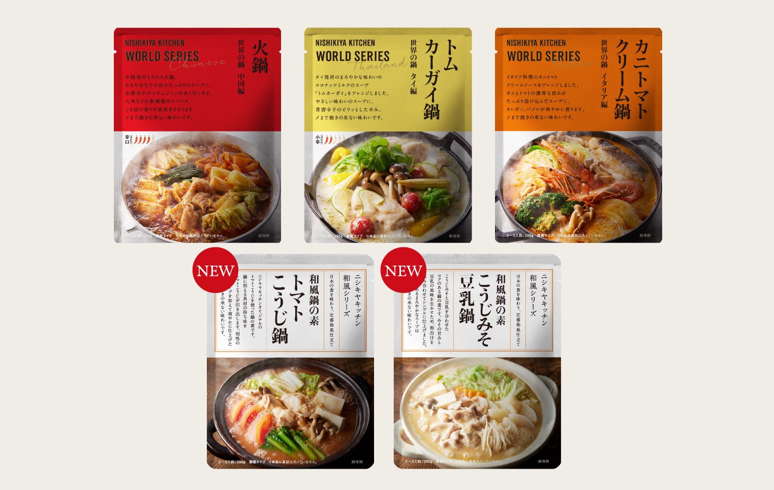 ニシキヤキッチンは2020年より、世界の料理を鍋で楽しめる「世界の鍋シリーズ」を発売しました。ラインナップは「火鍋の素」「トムカーガイの鍋の素」「カニトマトクリーム鍋の素」の3種類で、他にはない個性豊かな味わいがお客様からご好評をいただいています。その中で「家族みんなで食べられる味わいの鍋の素もほしい」というお客様からのお声があり、和風で食べやすい味わいの商品企画がスタートしました。