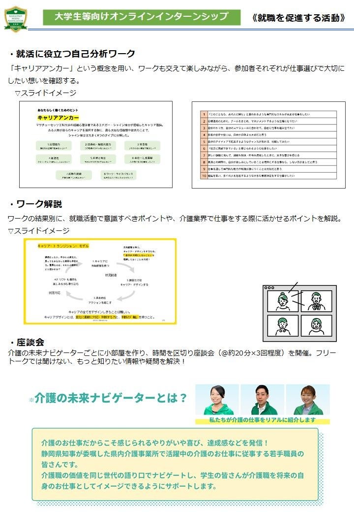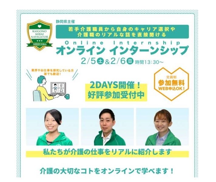 静岡県は、2月5日(土)と6日(日)に就職活動を控える学生を対象に、『介護の未来ナビゲーターオンラインインターンシップ』を開催します。