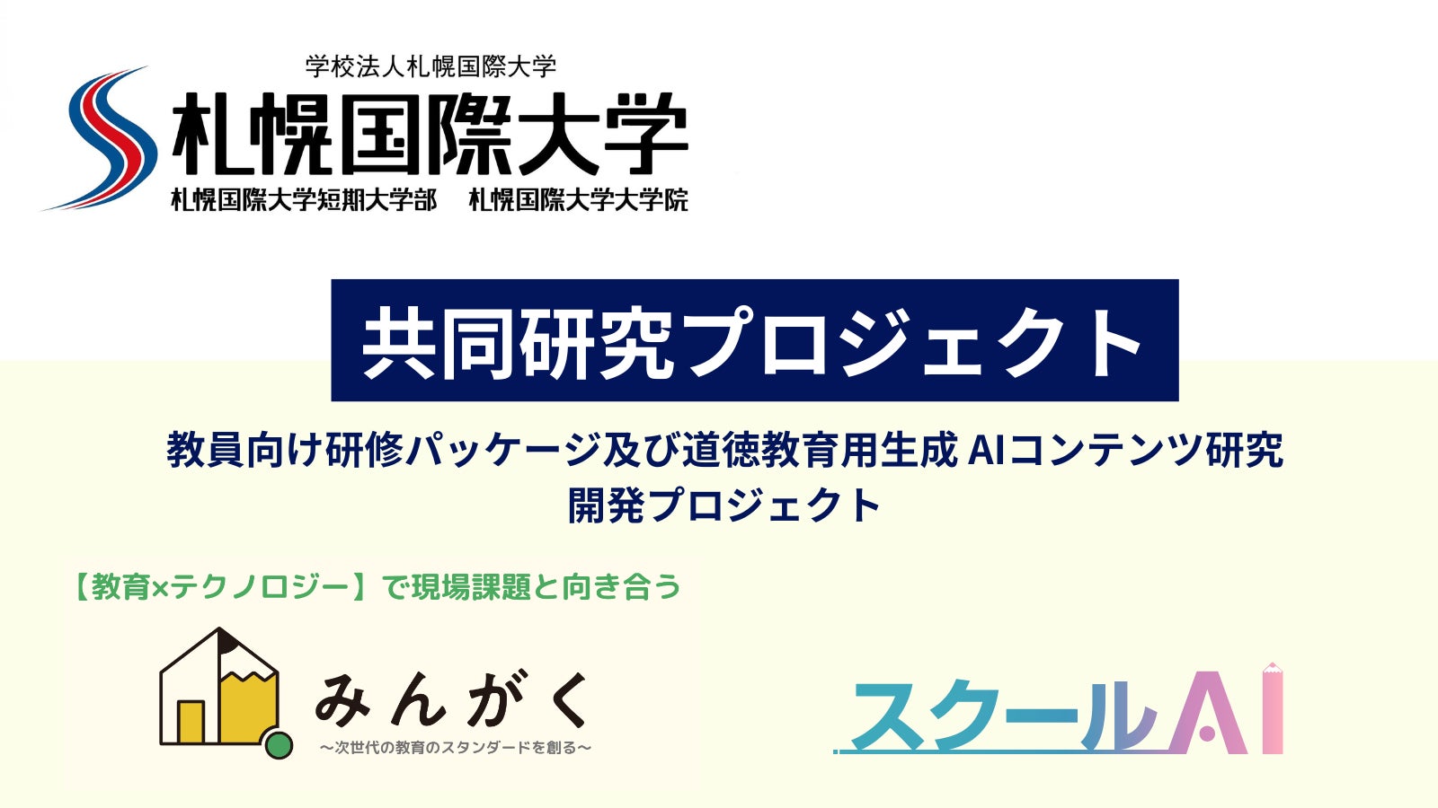 教育×生成AIをテーマに、教育サービス開発を⼿掛ける株式会社みんがく(東京都⽬⿊区、代表取締役:佐藤雄太)は、札幌国際大学(北海道札幌市、学長:蔵満保幸)と教育現場における生成AI活用に関する共同研究を開始することを発表します。