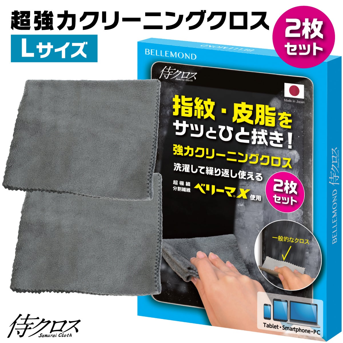 【侍クロス】日本製の超強力クリーニングクロス!マイクロファイバー「超極細繊維 ベリーマ(R)X」使用。2枚組で洗濯可能。スマホ・ノートPC・タブレット・メガネ・有機elテレビ・楽器・車用におすすめ!
