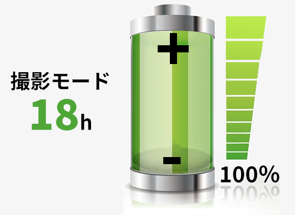 長時間の撮影を楽しんでいただけるように「Q3」は1800mAhの超大容量バッテリーを搭載しており、3時間フル充電すれば、なんと最大18時間連続撮影できます!さらに、充電しながら使用可能なので、モバイルバッテリーに接続しながら使用すれば記録中の電源切れの心配はありません。