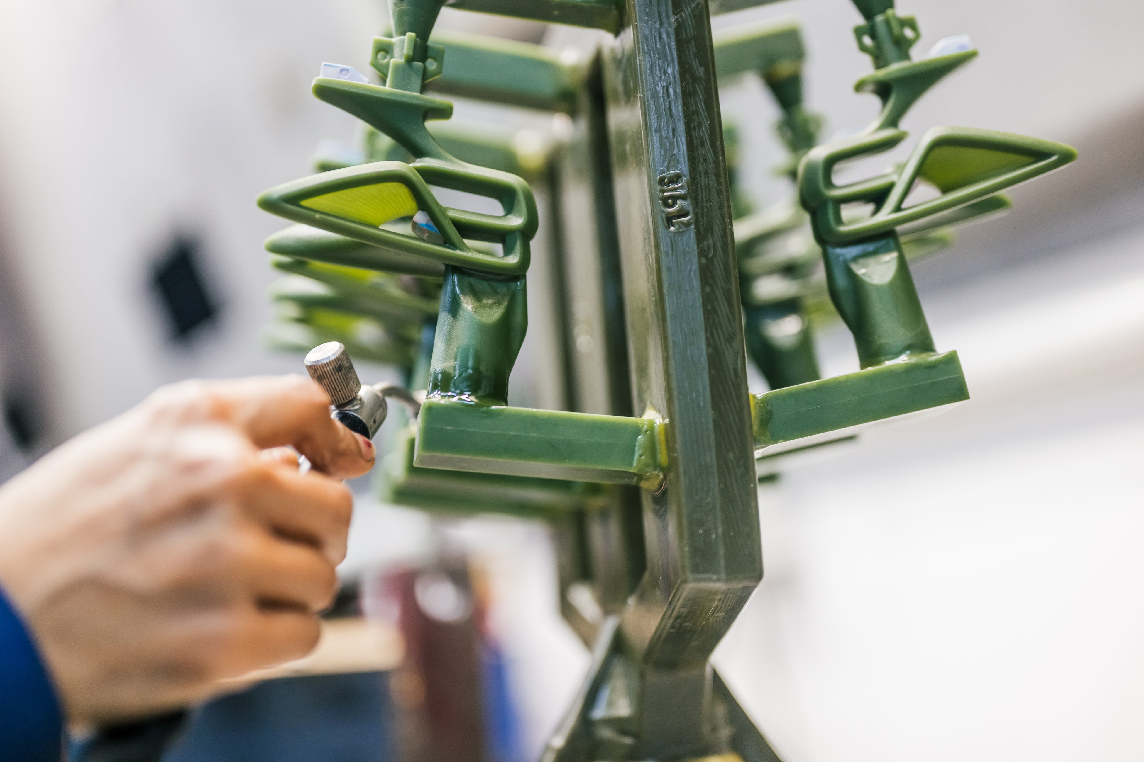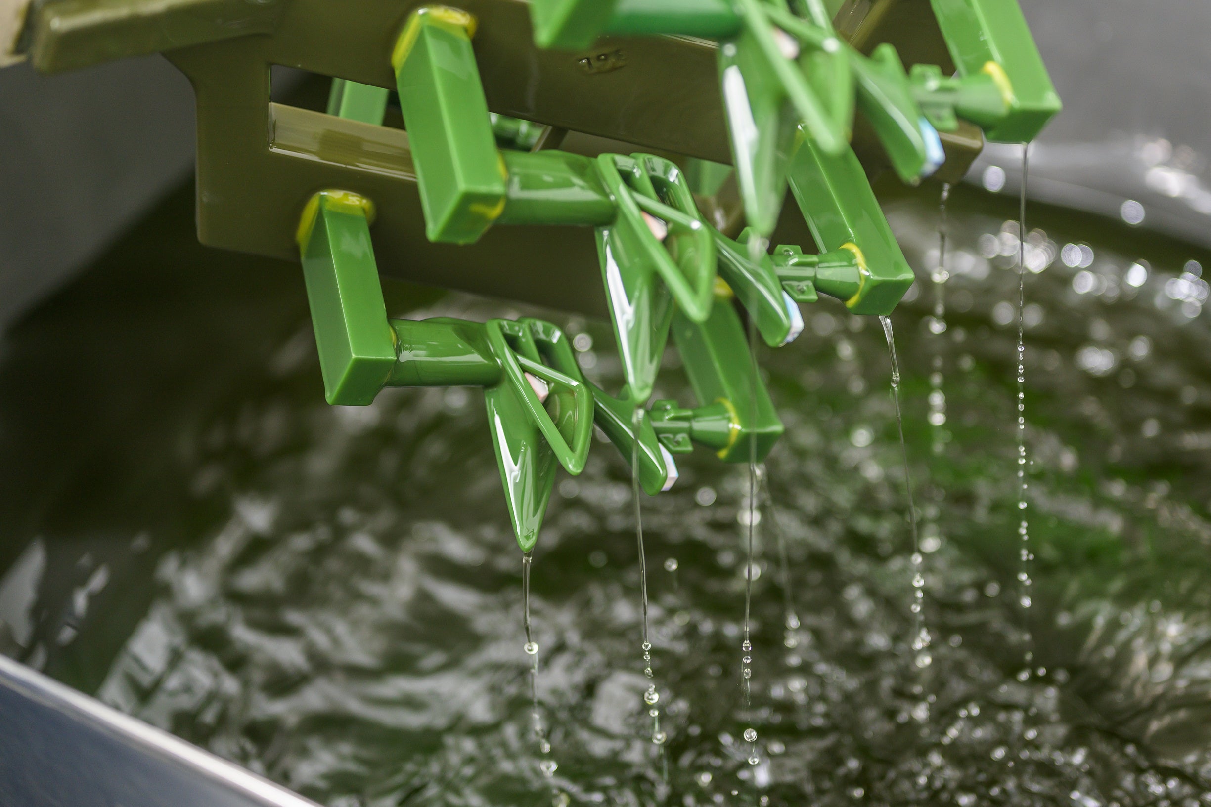 ここで、1,600℃に加熱した溶融316ステンレススチールをセラミック製の鋳型に流し込みます。鋼鉄が冷えて固まると、外側のセラミックが取り除かれ、セラミックのコアは苛性溶液を使って加圧溶解されます。ショットブラストで微量のセラミックを除去し、「エクストルードホーニング」と呼ばれる工程で内部の通路を滑らかにして配線が通れるようにします。