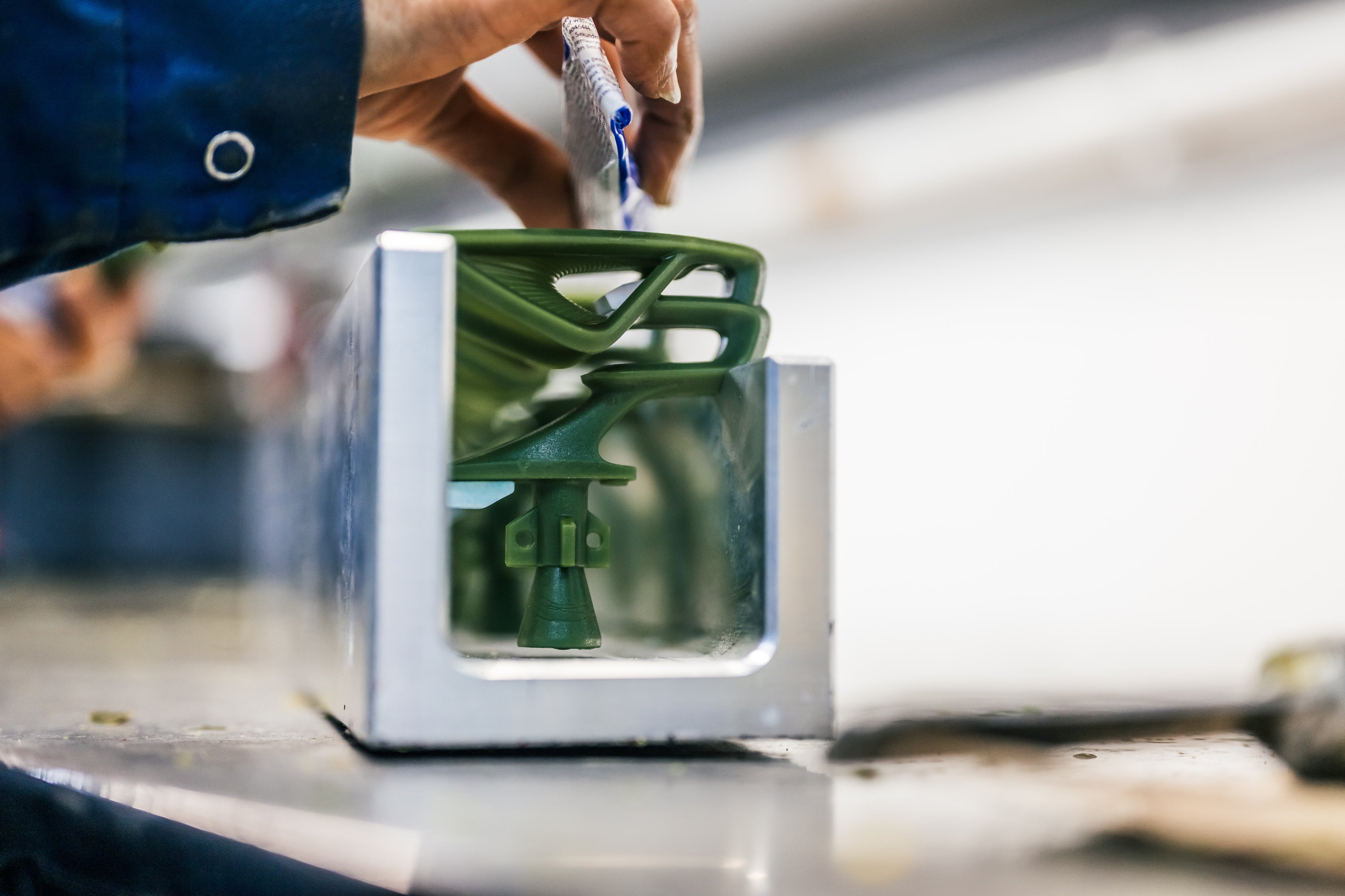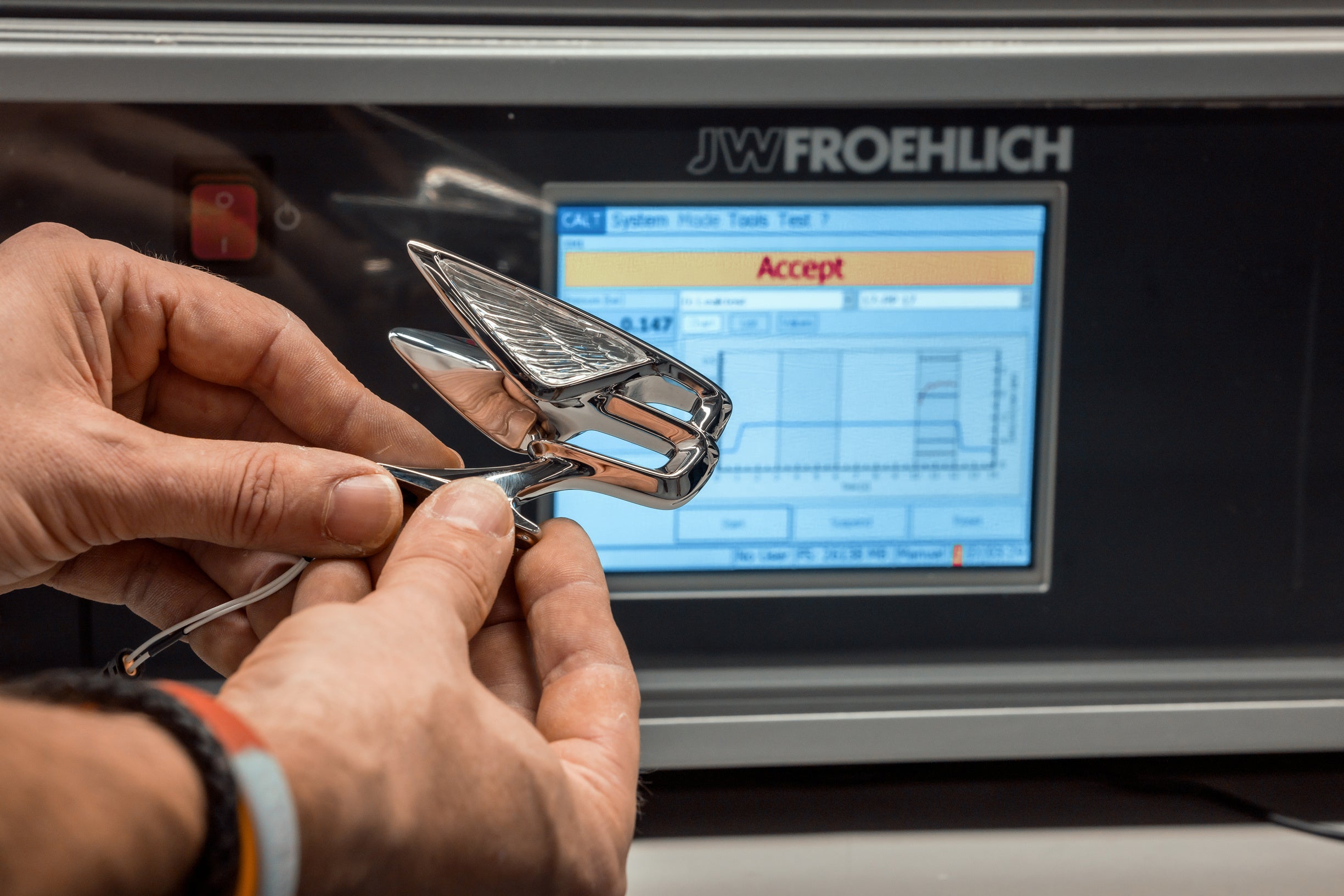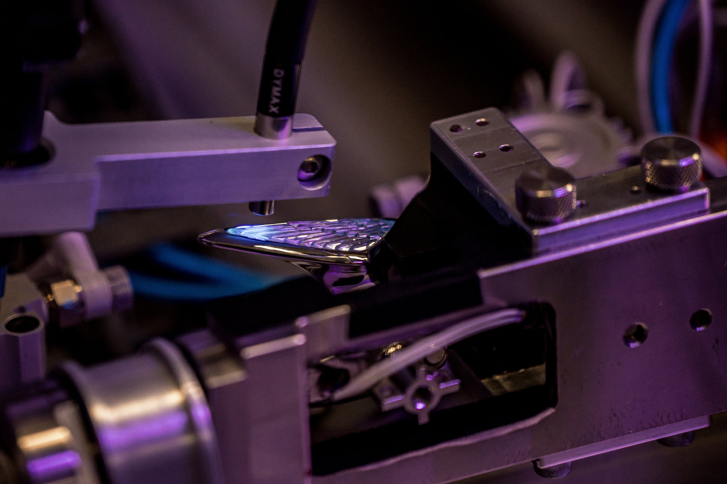 まず、溶けたロウを金型に注入します。水溶性のコアがアクリルのクリスタルの2つの翼が収まる空洞を満たし、セラミックの中心コアがワックス型に照明配線のための通路を作ります。その後、ワックスのエンブレムを金型から取り外し、水溶性コアを溶かしてワックスで完璧な「フライングB」を作ります。