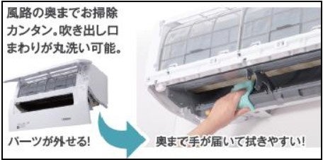 下部カバーが取り外しできるので、掃除しづらいフラップや吹出口、風路部分のお手入れがらくらくできます。