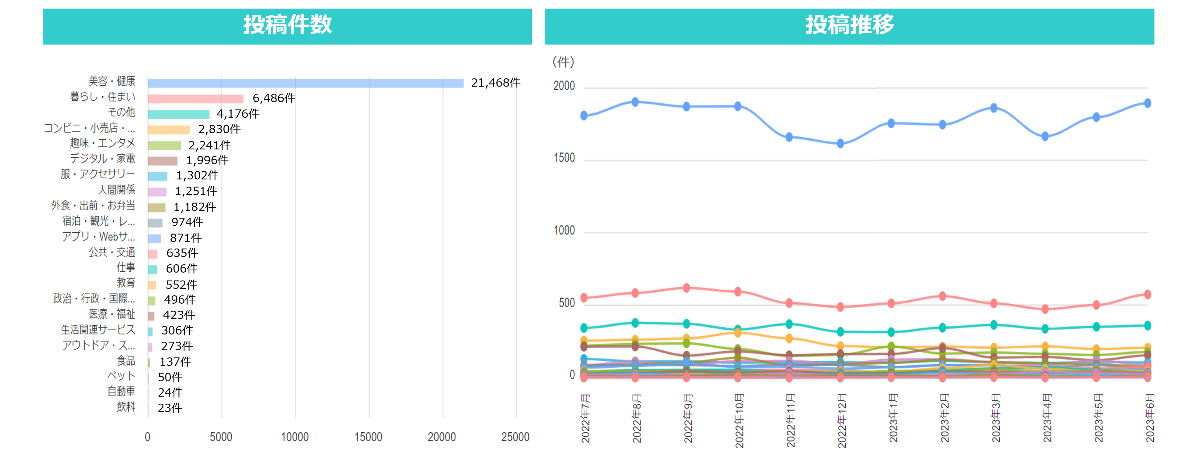 カテゴリ毎に見た不満投稿数は、1位 美容・健康、2位 暮らし・住まい、3位 その他 と続いた。 「美容・健康」「暮らし・住まい」の2カテゴリで全体の約6割を占める結果となった。