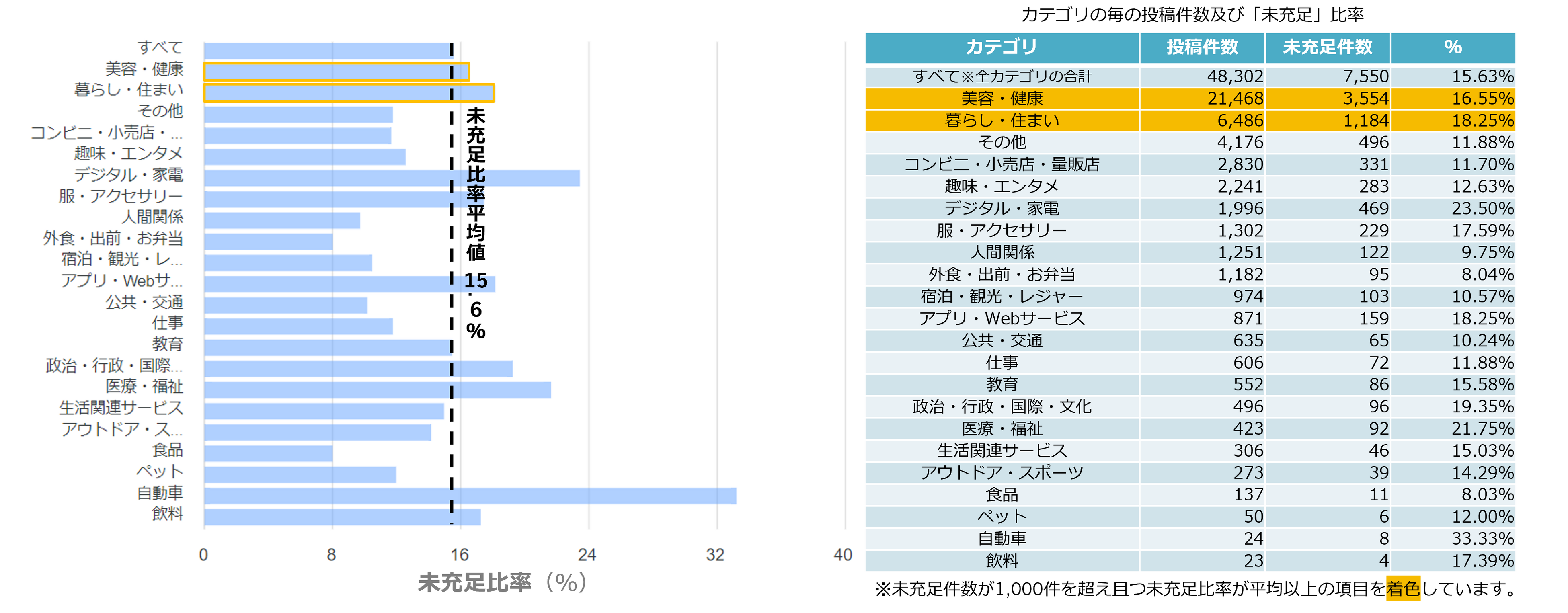 カテゴリ毎に「未充足」表現が含まれる投稿件数と比率を比較した。 未充足不満の投稿件数は「美容・健康」「暮らし・住まい」「その他」が上位となった。 未充足比率の全体平均を上回るカテゴリは22カテゴリ中9カテゴリ存在。今回は未充足件数が1,000件を超えるカテゴリに着目し不満内容の深掘りを行った。