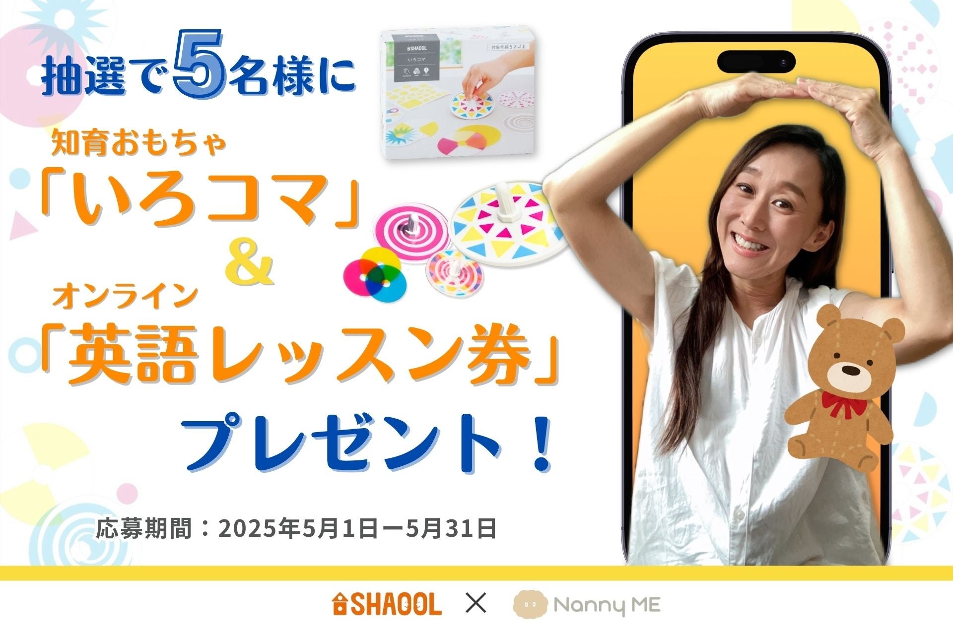 この度、NannyMEとシャオールの公式InstagramまたはXをフォロー、応募してくださった方の中から抽選で5名様に、シャオールの人気知育玩具「いろコマ」&NannyMEオンライン英語レッスン券をWでプレゼントするキャンペーンを実施します。