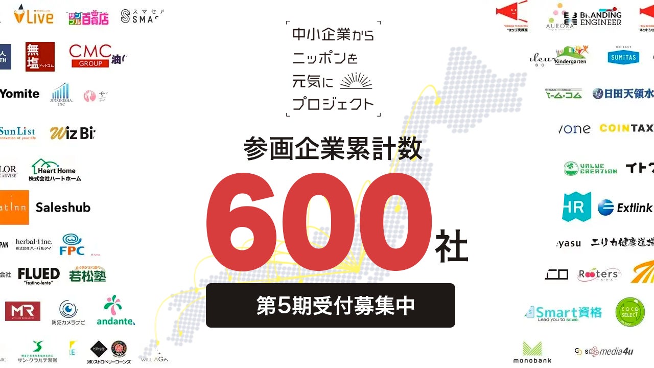 中小企業支援(ブランディング、WEB マーケティング、SDGs支援、ビジネスマッチング)事業を行う株式会社中小企業のチカラ(本社:東京都渋谷区、代表取締役社長:山下 佳介、以下「中小企業のチカラ」)(https://smes-chikara.co.jp/)が運営する『中小企業からニッポンを元気にプロジェクト』( https://nippon-smes-project.com/ )への参画企業が累計600社を突破いたしました。
