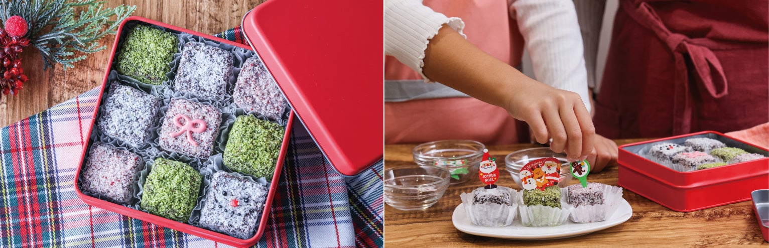 ふわふわのスポンジシートに3種のガナッシュを挟み、チョコレートソースやココナッツファインをコーティングして仕上げるラミントンは、見た目も華やか。クッキー缶に詰めれば、クリスマスギフトにもぴったりです。