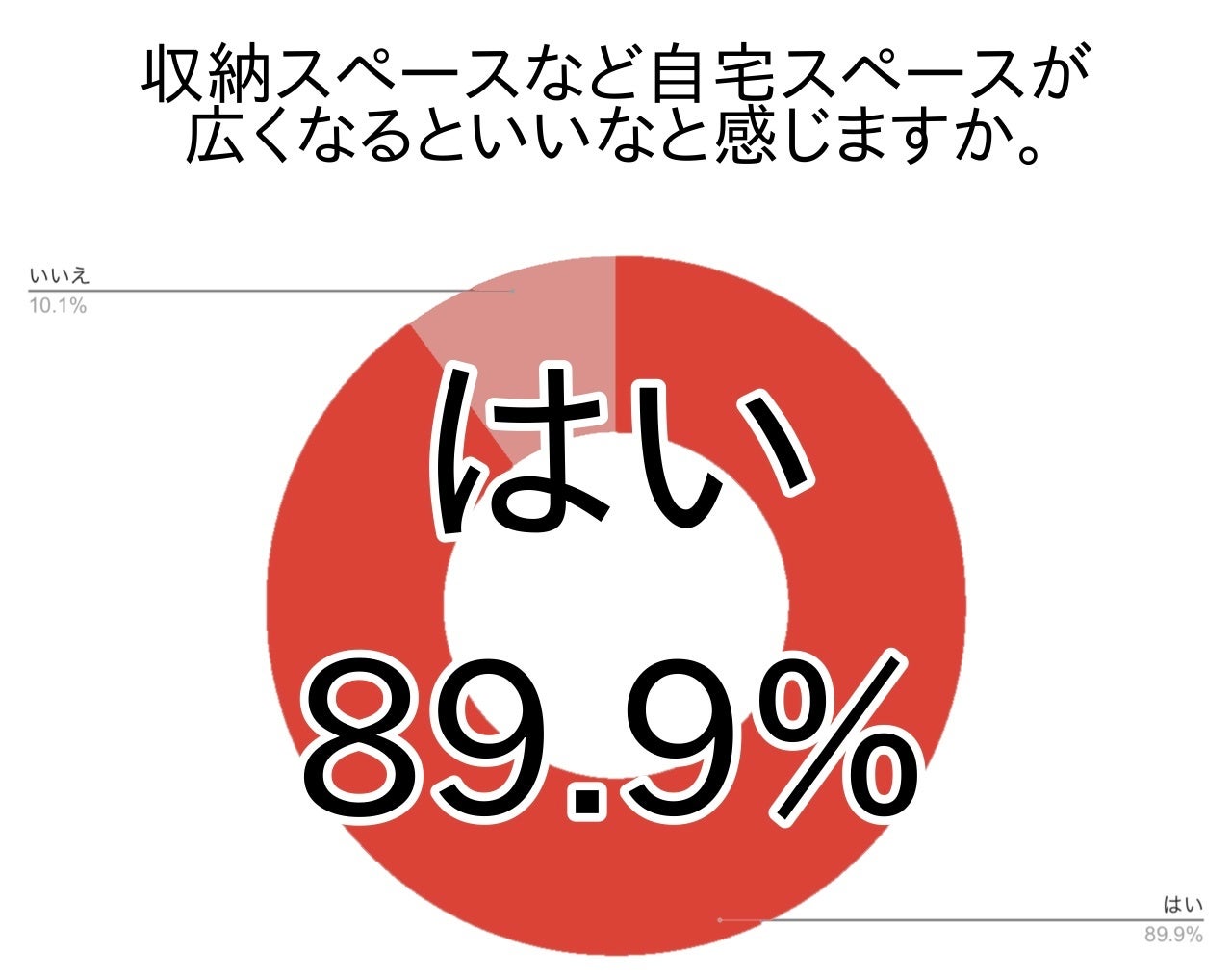 アンケートでは収納スペースなど自宅スペースが広くなるといいなと感じると答えた方が関東で約9割(89.9%)・全国で約8割(84.8%)でした。関東は全国よりやや高い割合でした。