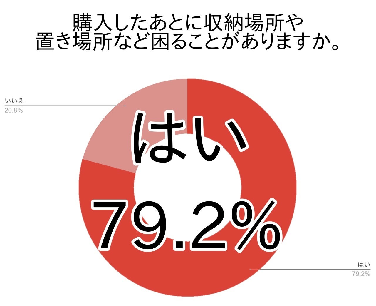 アンケートでは購入したあとに収納場所や置き場所など困ることがあると答えた方が関東で79.2%(男性81.0%・女性77.6%)、全国で67.7%(男性65.6%・女性70.7%)でした。関東は全国より高い割合でした。