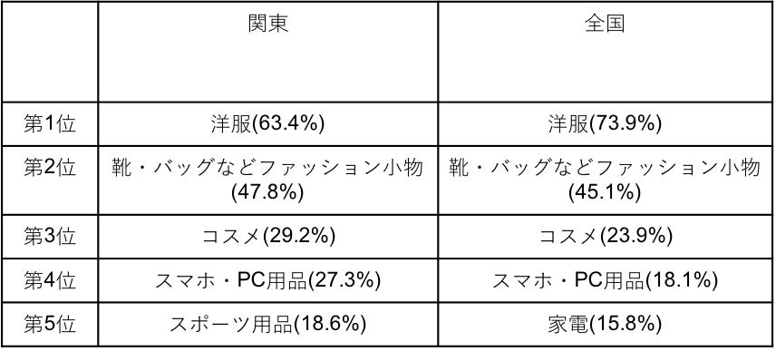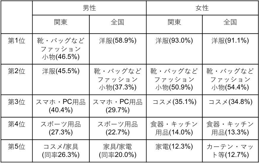 関東・全国とも男女問わずトップ2は「洋服」及び「靴・バッグなどファッション小物」でした。洋服は女性で関東・全国とも約9割(関東93.0%・全国91.1%)だったことも特徴的でした。