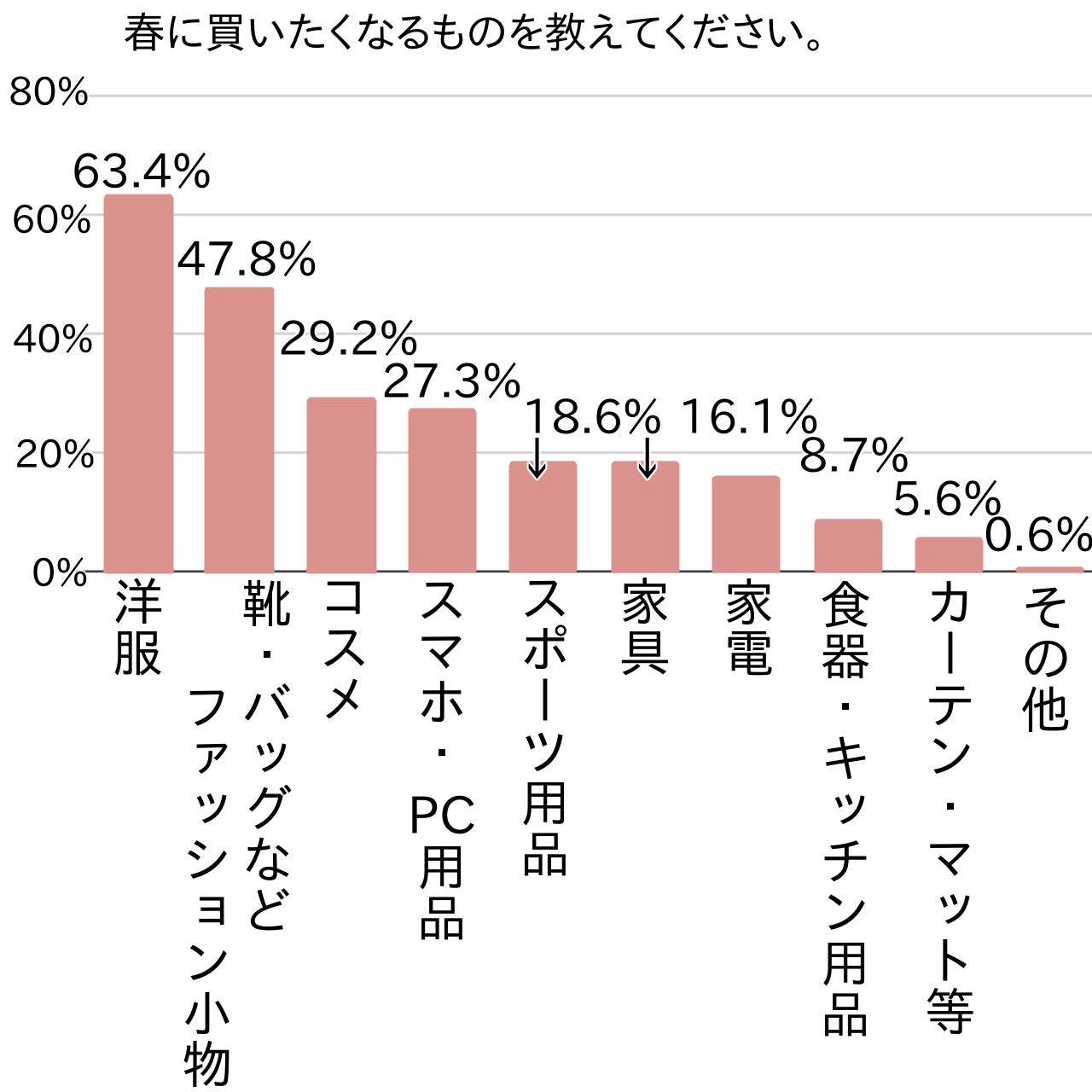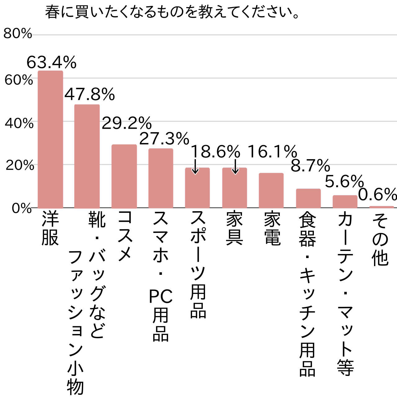 春は性別・地方問わず新しいものを買いたくなることがある方が8割以上を占めることがわかりました。そこで、アンケートでは次に、春に買いたくなるものを尋ねました。