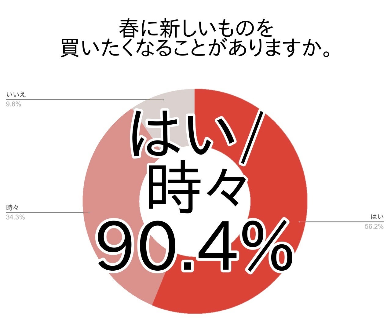 また、「時々(関東34.3%・全国40.5%)」と合わせて、春に新しいものを買いたくなることが少しでもある方は約9割(関東90.4%・全国87.3%)にのぼりました。